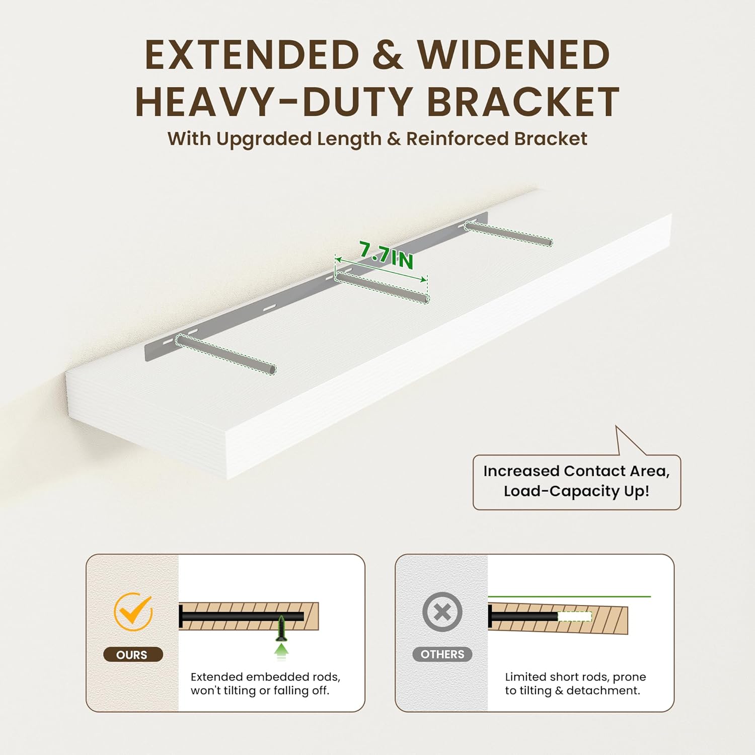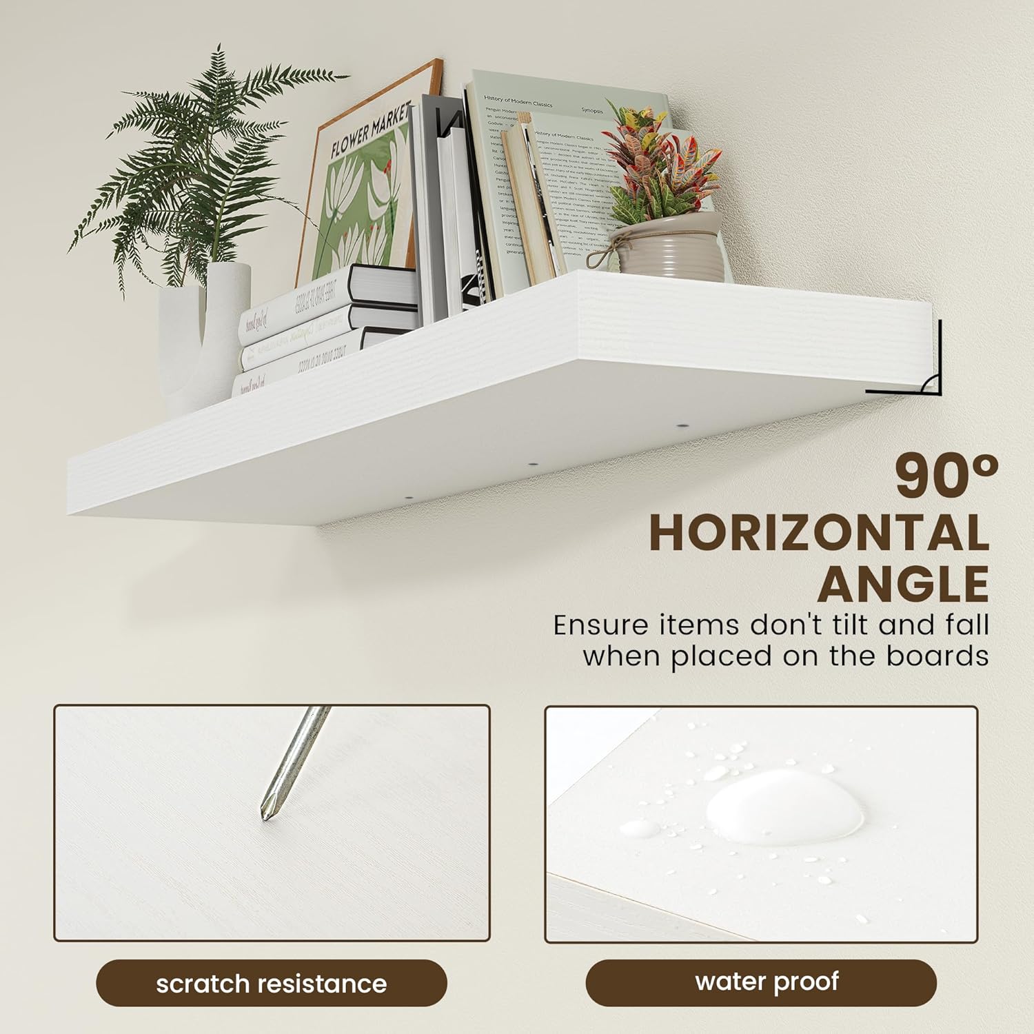- EASY TO INSTALL - Come with all the installation hardware you need. We have a smart installation design. Thicken metal brackets help boards to be stable and load-bearing, vertical to the wall, and not sagging. The shelves have pre-drilled holes in the bottom to allow screws to secure the boards to the brackets to prevent them from slipping