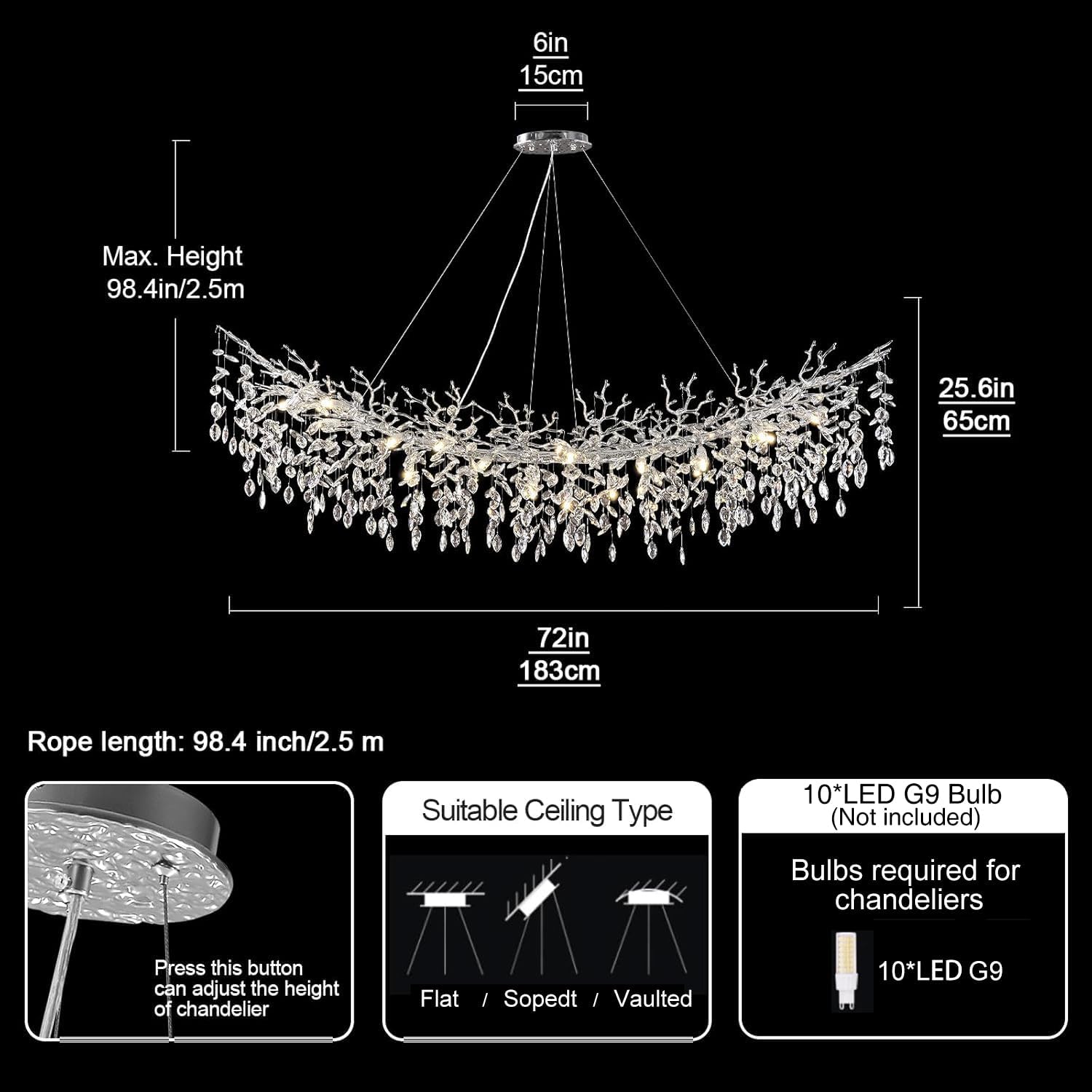 - Humanized Installation:The light body dimensions are L: 72in, W: 20in, H: 25.5in, and the pendant cable is adjustable from 0-71 inches.. The Chandelier'S Branches Are Made Of Aluminum Alloy One-Piece Molding, It'S Light Enough And At The Same Time Provides Enough Support. Each Branch Is Removable And Can Be Easily Assembled. Simply Hang The Crystals From The Branches. (Note: There Are Different Sides Of The Branch, Please Install The Chandelier With The Front Side Facing Up, You Can Also Refer To The Installation Instructions For Installation)
