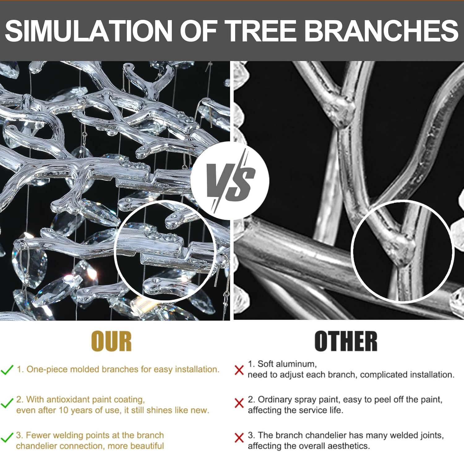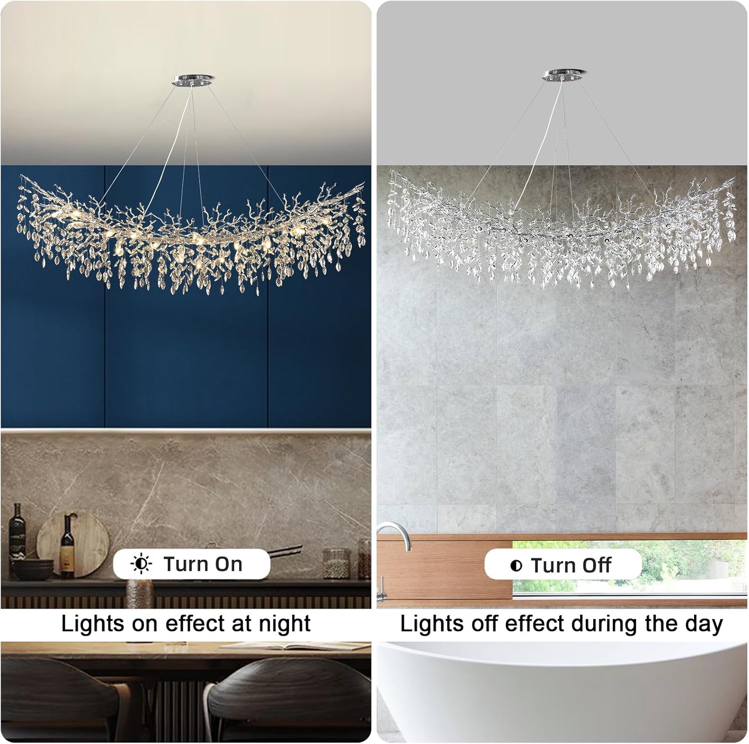 - Modern Crystal Chandelier:Transform your living space into a captivating masterpiece with our Elegant Crystal Tree Branches Chandelier. This stunning chandelier is designed to impress, featuring a unique tree branch-inspired design adorned with glistening crystals that cast a mesmerizing play of light and shadow.