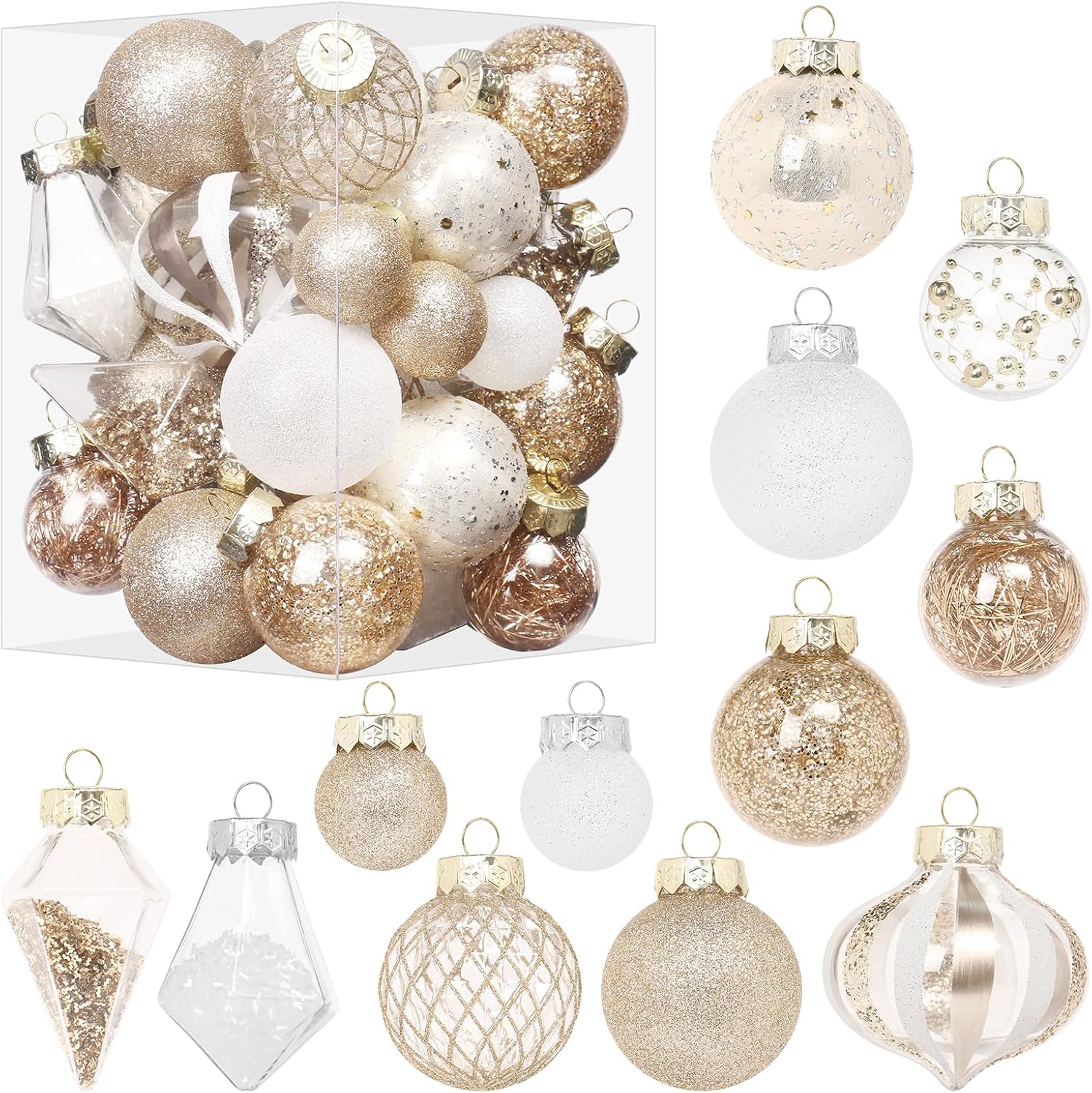 Christmas Ball Ornaments Set, 34PCS Clear Plastic Shatterproof Christmas Ornaments for Xmas Tree Hanging Decorations, for Indoor Home Thanksgiving Party Decor - Champagne/White.