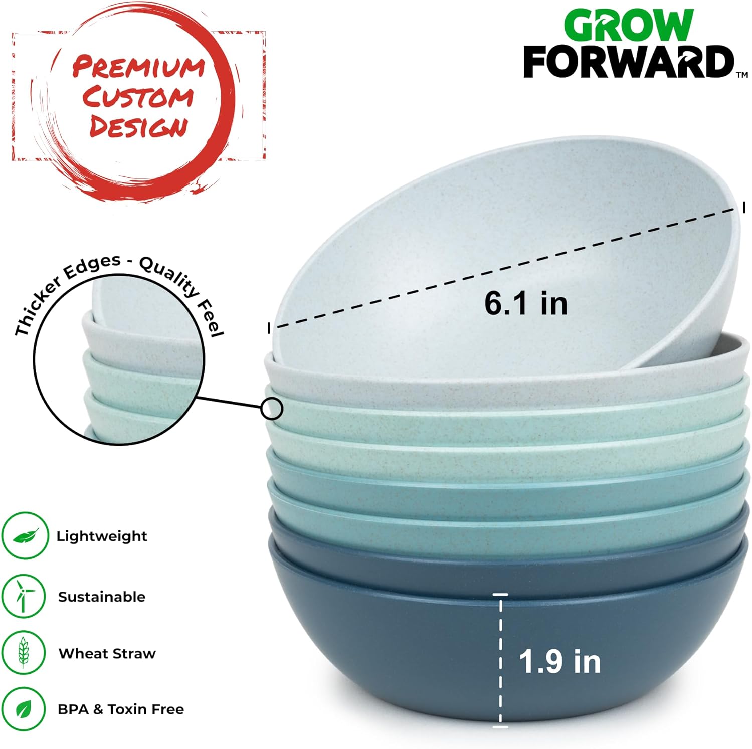 - [ Charming Wheat Straw Bowls Set of 8 ] - Elevate everyday meals into delightful displays of color and flavor with our unbreakable wheat straw bowls set. Featuring 8 kitchen bowls in beautiful color tones that you'll not only be able to eat from but admire and appreciate. A great gift for eco-minded people and families. Matches perfectly with our Grow Forward wheat straw plates and cups!