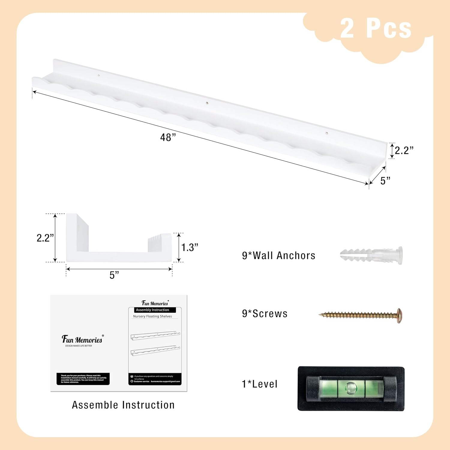 - ăLarge Storage Space Nursery ShelvesăEnhance your nursery space with these versatile floating ledge shelves. Kids can effortlessly store books, toys, stuffed animals, and games on these wall-mounted shelving units. Each nursery wall shelf measures 48Ă5Ă2 inches, and this set includes two packs for added convenience.
