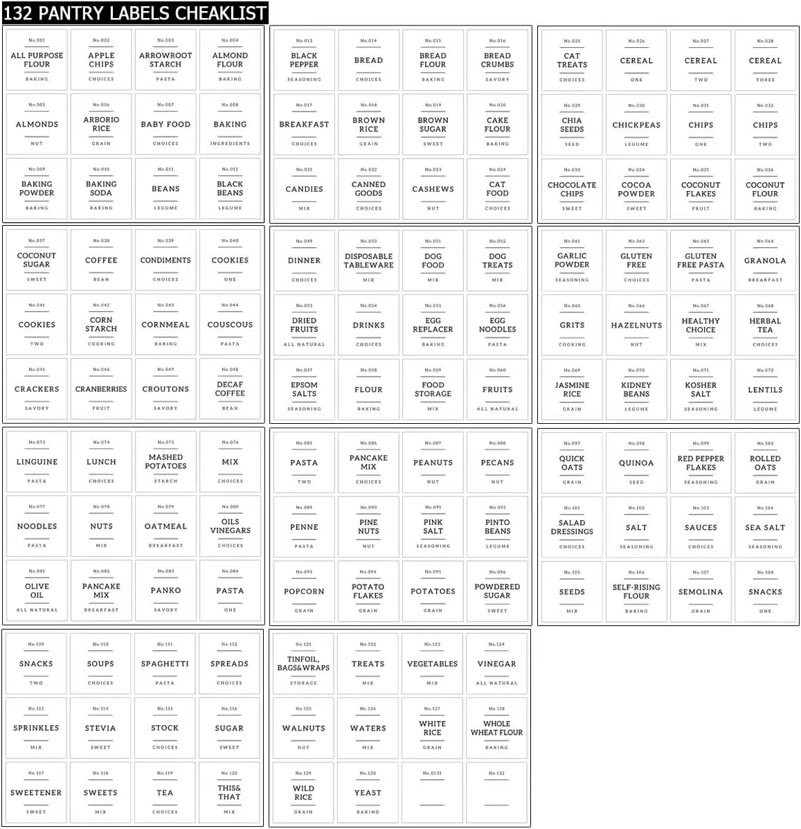 - 【PERFECT FOR PANTRY】132 Kitchen pantry labels for kitchen canisters to keep your food fresh and pantry tidy. Minimalist labels are black text on white food labels stickers suitable for all airtight storage containers. Pantry decal organization labels are preprinted on premium waterproof vinyl stickers that won't tear or peel off but can easily be removed.