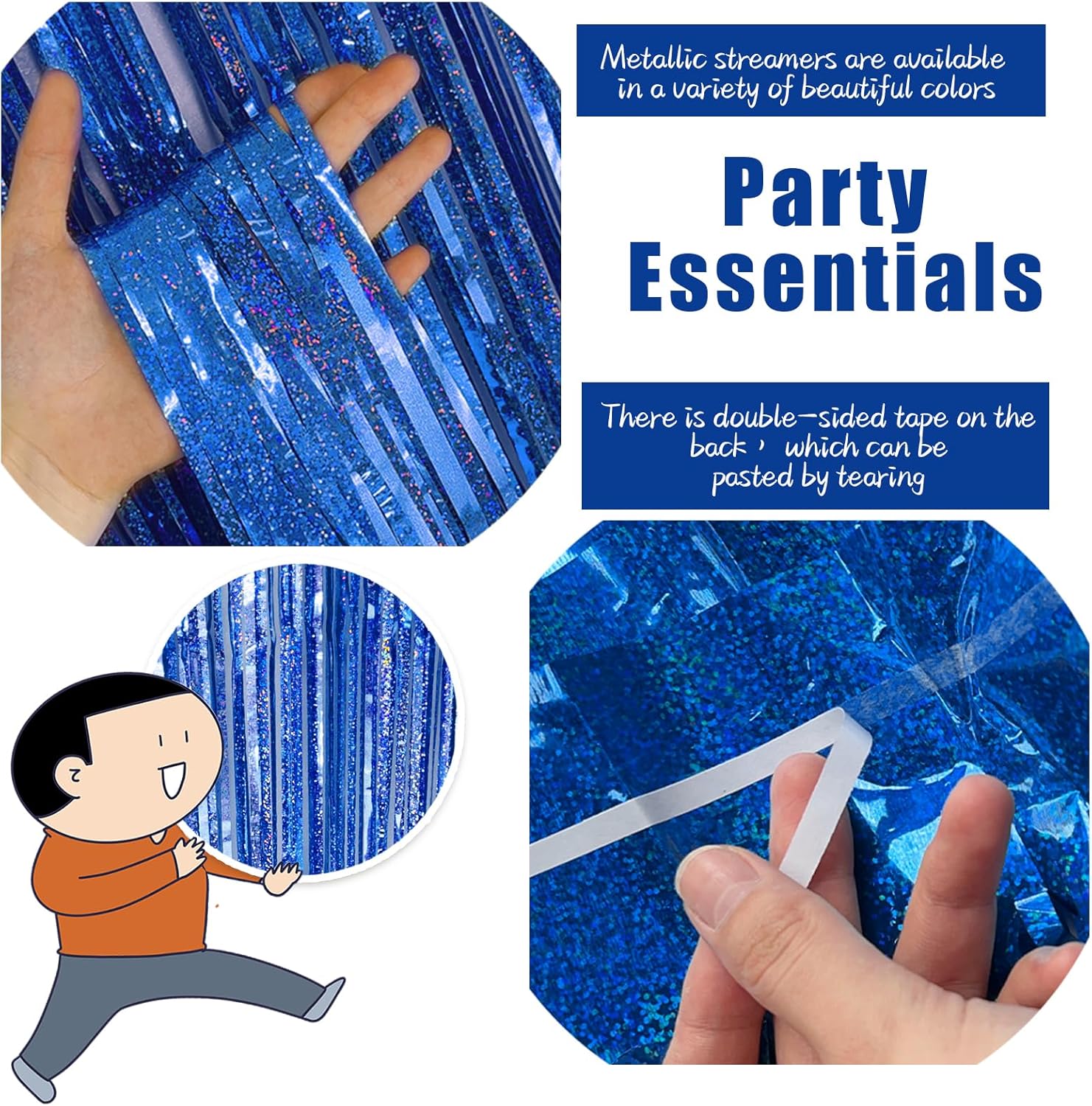 - Blue Birthday Decorations:3 packs of foil fringe curtains, the size of the foil curtain is 3.28 ft x 6.56 ft.It's long enough to fit any occasion. Please do not stick the foil curtain on uneven or stained walls to prevent it from falling off.