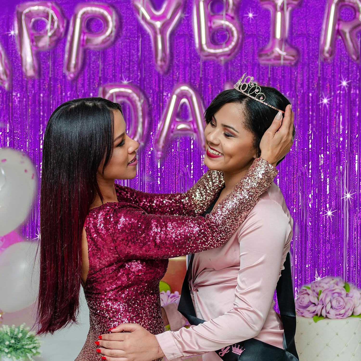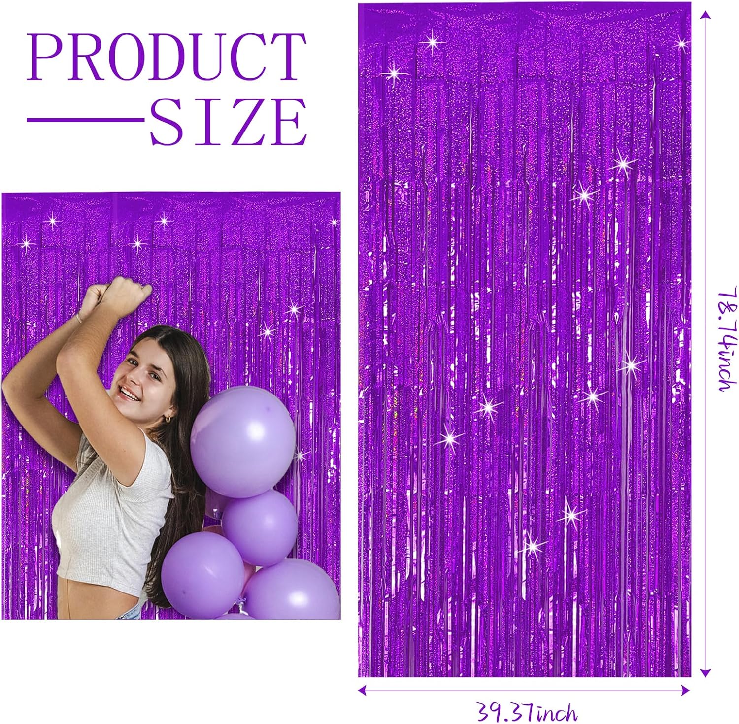 - Purple Party Decorations:3 packs of foil fringe curtains, the size of the foil curtain is 3.28 ft x 6.56 ft.It's long enough to fit any occasion. Please do not stick the foil curtain on uneven or stained walls to prevent it from falling off.