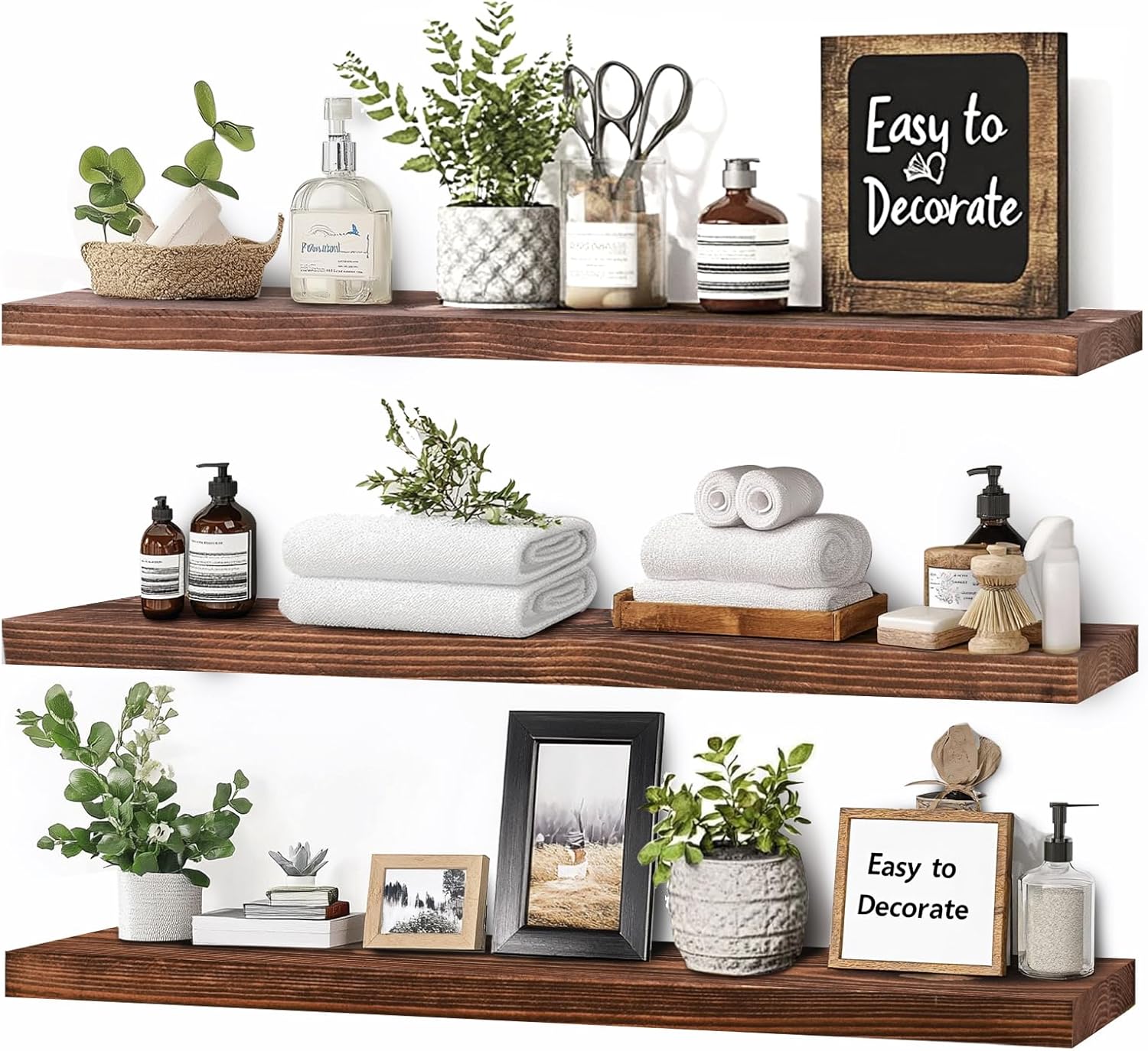 Floating Wall Shelves 3-Pack - 24-Inch Rustic Brown Wooden Shelves for Storage and Décor, Easy Installation for Living Room, Bedroom, and Kitchen