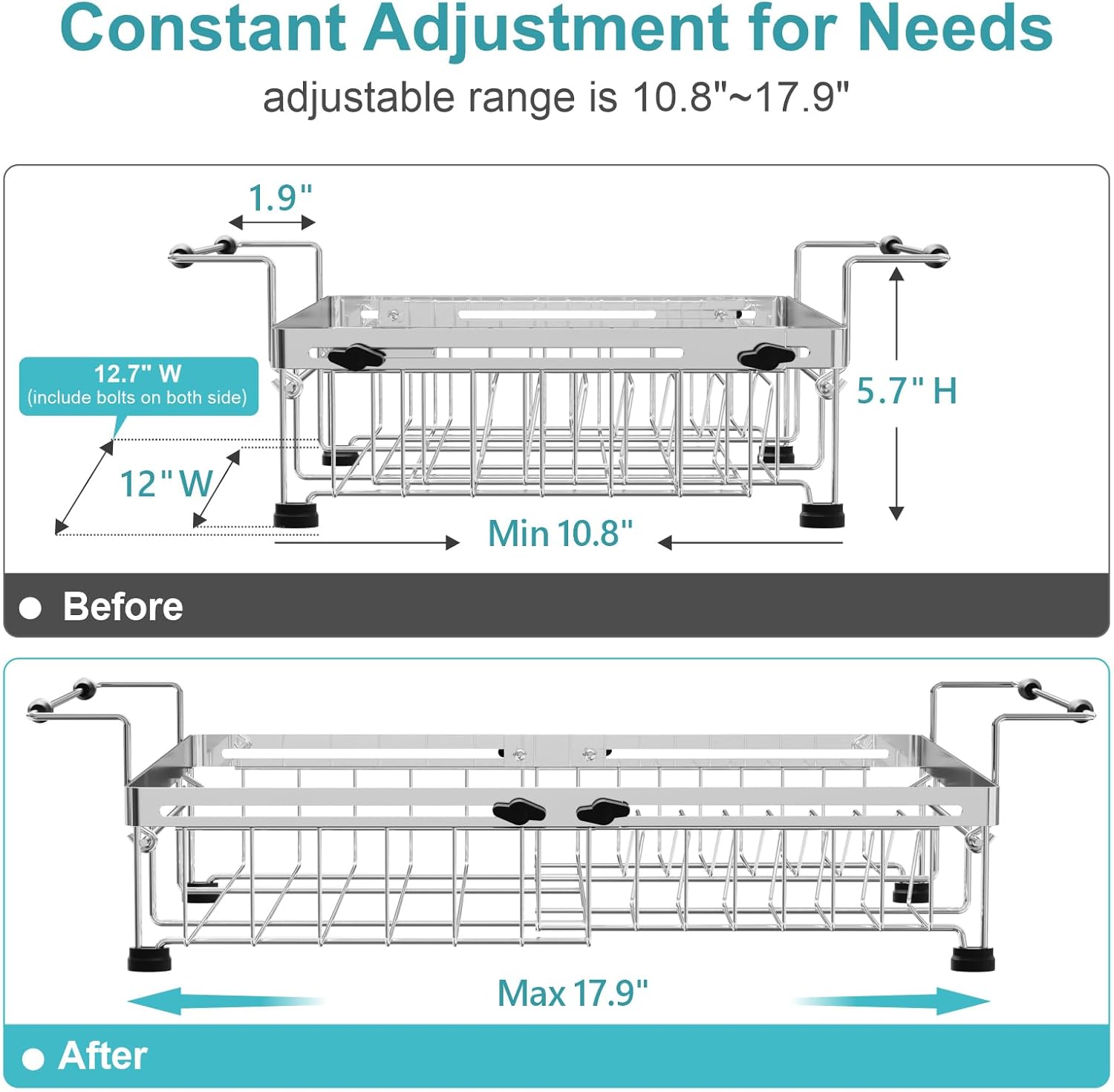 - Capacity Expandable Design: The main body of this dish drying rack is adjustable, making it easy for you to adjust the capacity according to the sink or counter size to maximize the use of space. You can put it in the sink, over the sink or on the countertop. Before purchasing, verify that your sink's size fall within the specified range of 10.8" to 19.4" for a good fit. Size(not include handle length): (10.8~17.9)'' L x 12.7'' W x 5.7'' H