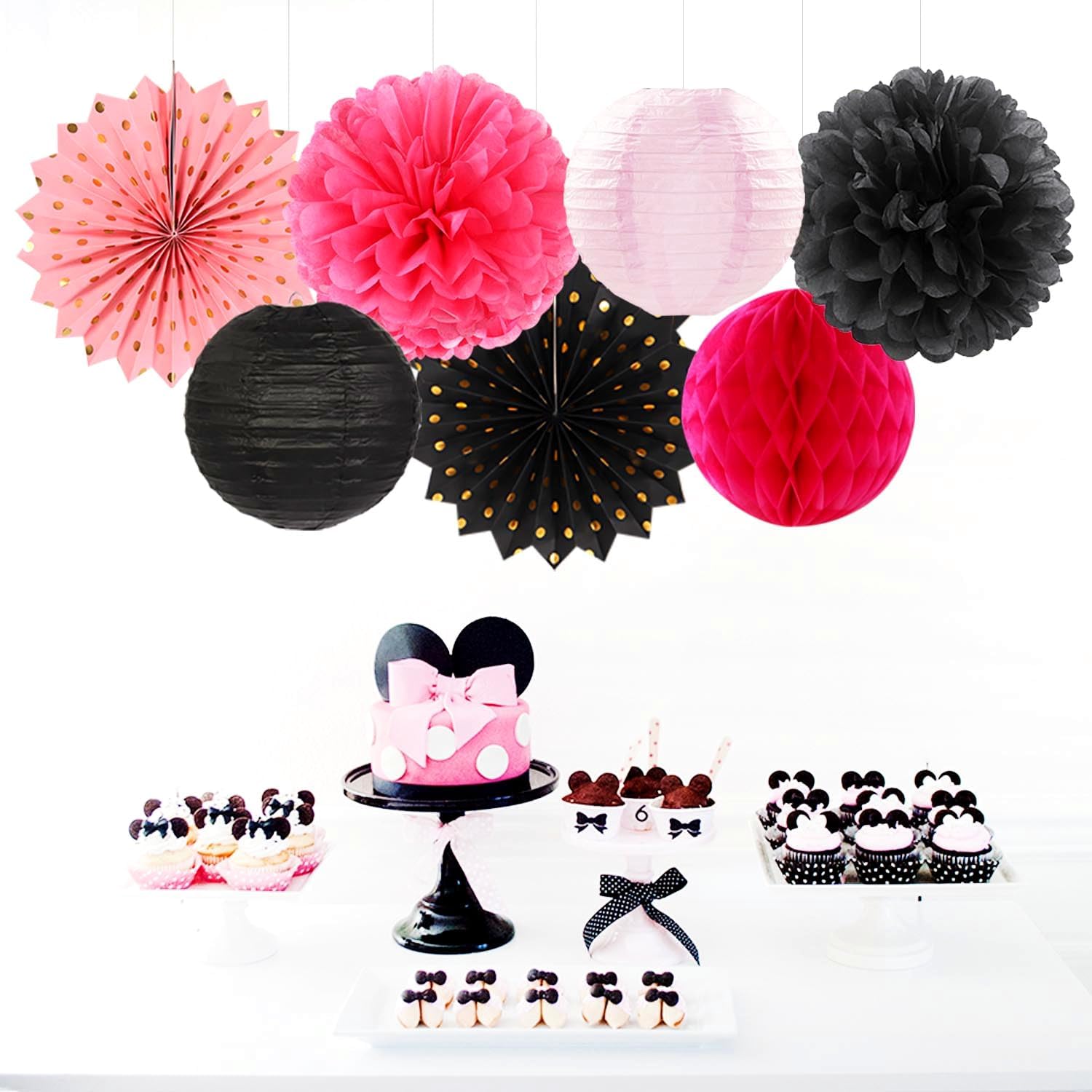 • 【Package Contains】The hot pink black party kits include 6pcs tissue paper flowers: 3pcs 10" and 3pcs 12" in three color, 2pcs 8inch paper honeycom ball,4pcs 8inch paper lantern, 2pcs 12inch paper fan.