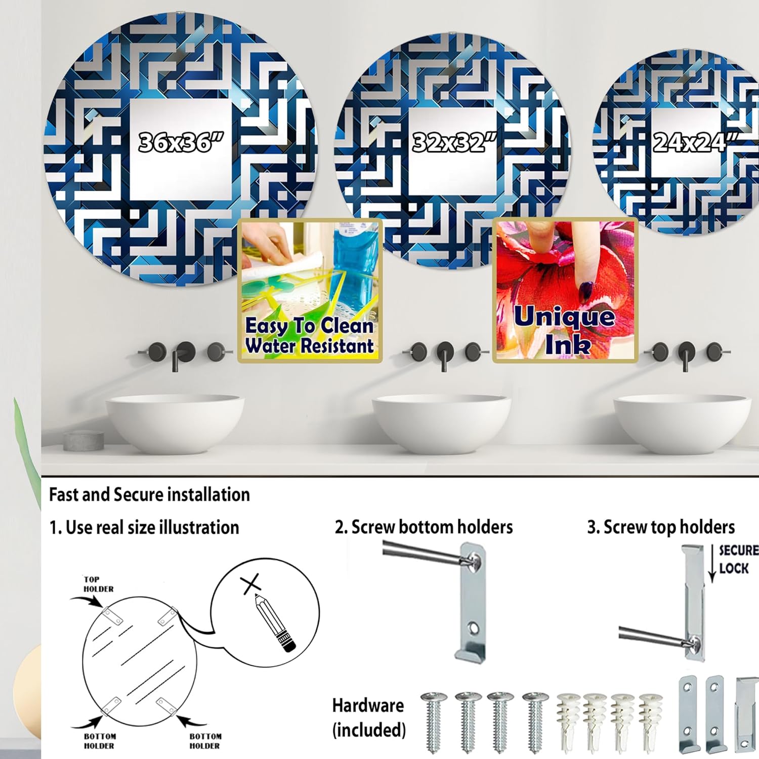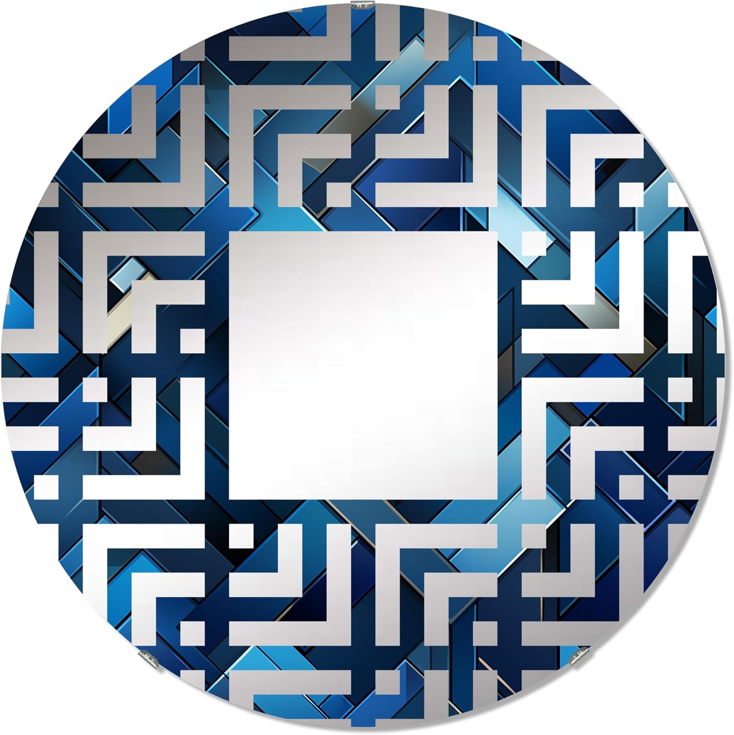 Symmetric Cubes in Deep Cobalt Blue - Geometric Maze - 32 Inches - Round Decorative Wall Mirror for Bathroom, Bedroom, Entryway, Living Room, Vanity Room and Modern Décor