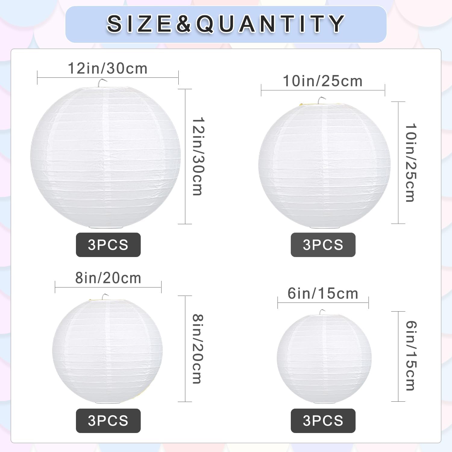 - ăPackageă: You will receive 12 pieces of basic paper lanterns. (Size: 6inch * 3pcs). (Size: 8inch * 3pcs). (Size: 10inch * 3pcs). (Size: 12inch * 3pcs).