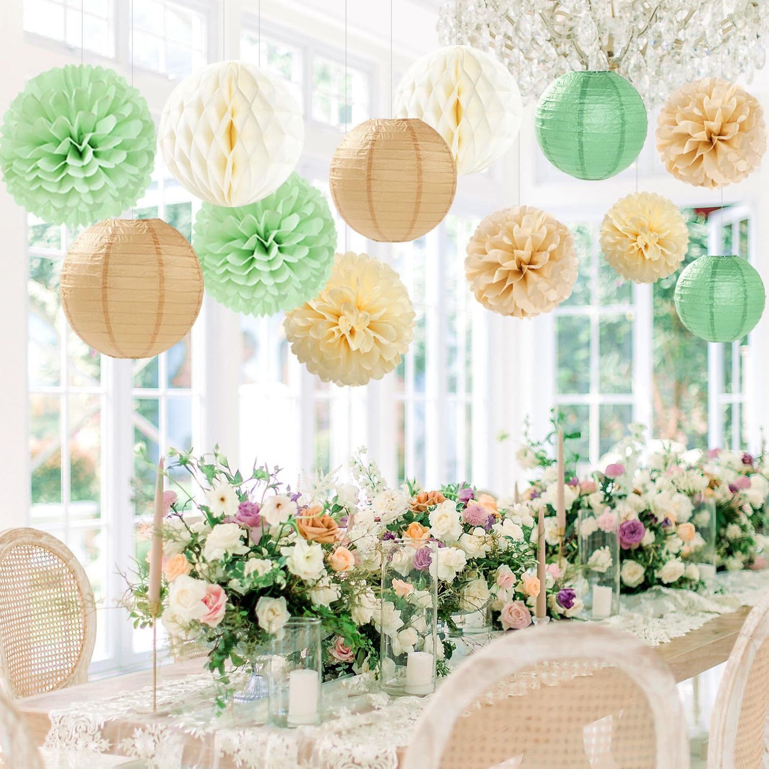 • 【Wide Use】These paper lanterns and pom poms are great for indoor and outdoor events such as safari baby shower decorations,boho bridal shower neutral,rustic wedding decor,sage green birthday,graduation,bachelorette,jungle theme party.