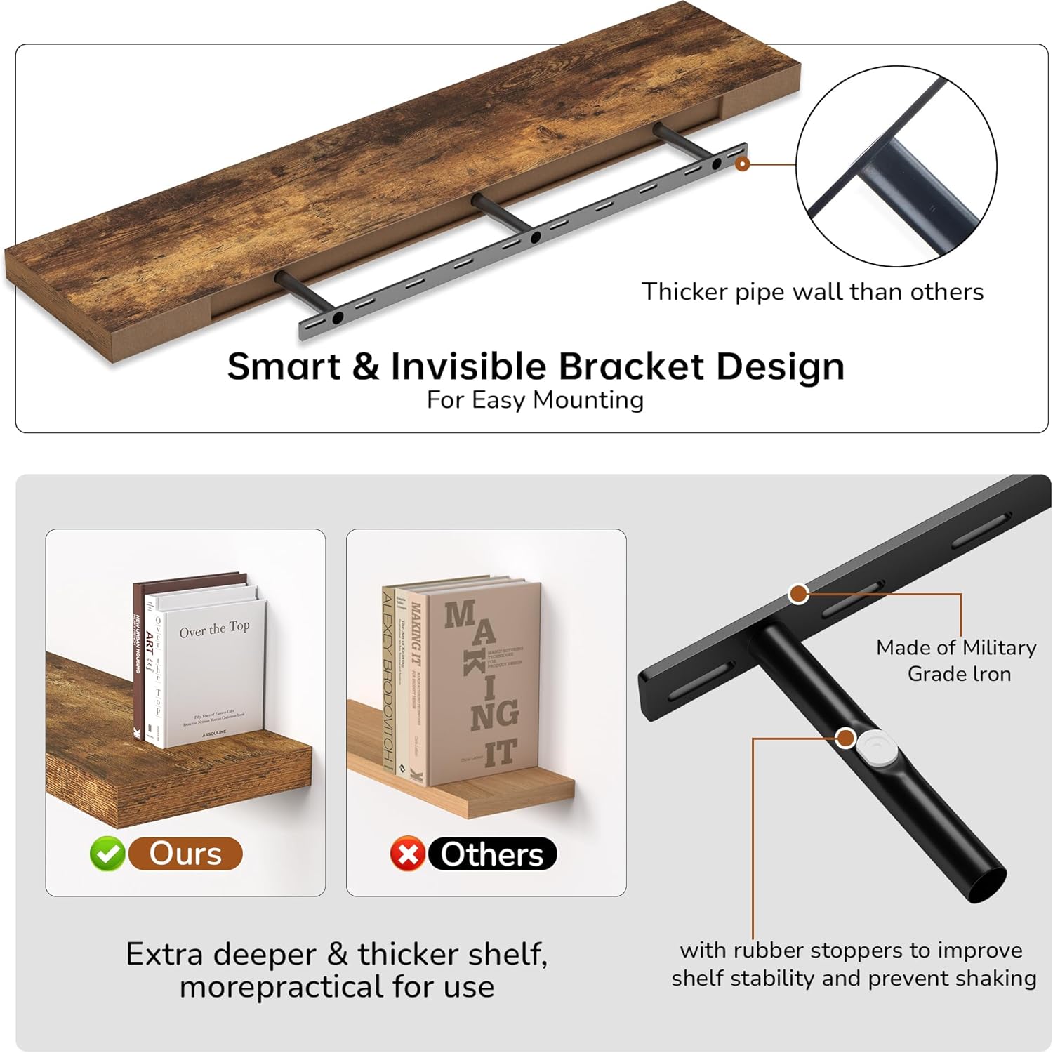 - Extra Deeper & Thicker - This wall shelf measures 48"W x 10.23"D x 1.8"H. Extra deeper and thicker design in order to bring maximizes storage space and weight capacity, even hold up to 75 lb. This floating shelf taking up zero square feet, reduces clutter and highlights dΓ©cor in compact spaces.