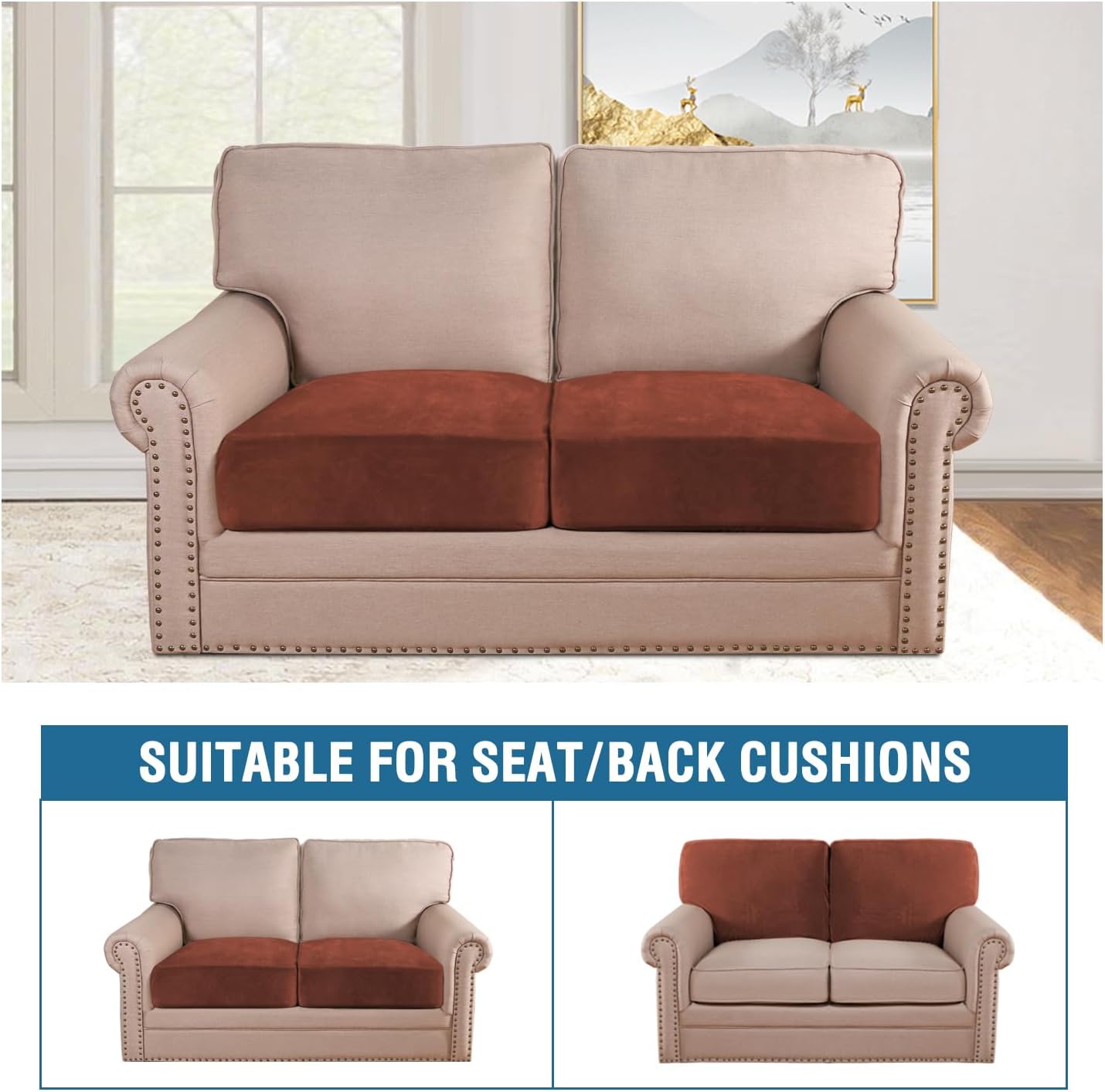 H.VERSAILTEX Velvet Stretch Couch Cushion Cover Plush Cushion Slipcover for Chair Loveseat Sofa Cushion Furniture Protector Seat Cushion Sofa Cover (2 Piece Medium Sofa Cushion Covers, Rust)