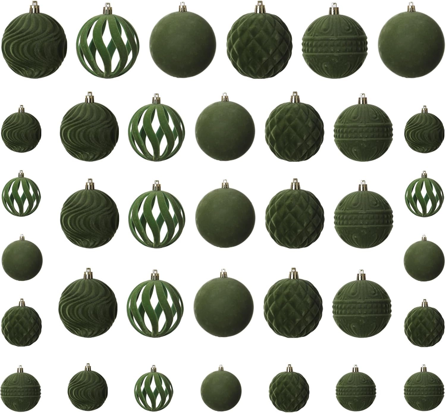 - Package List: the package contains 36pcs of flocked Christmas ball ornaments, measuring approx 3.15/2.36/1.57/inches in diameter, avocado green color,not only classic styles,but also innovative styles,including five shapes and nice texture can fully meet your needs for decorating