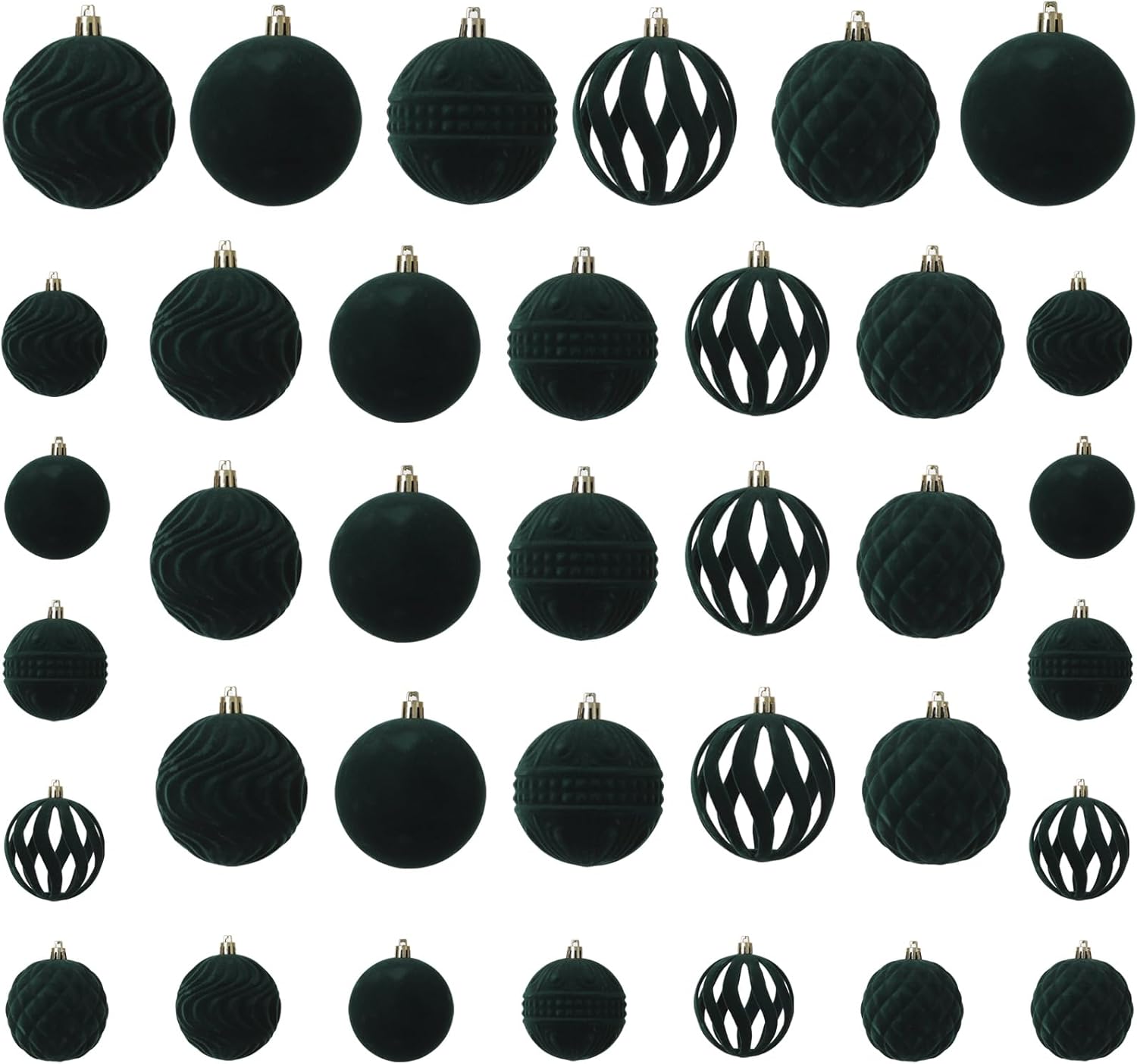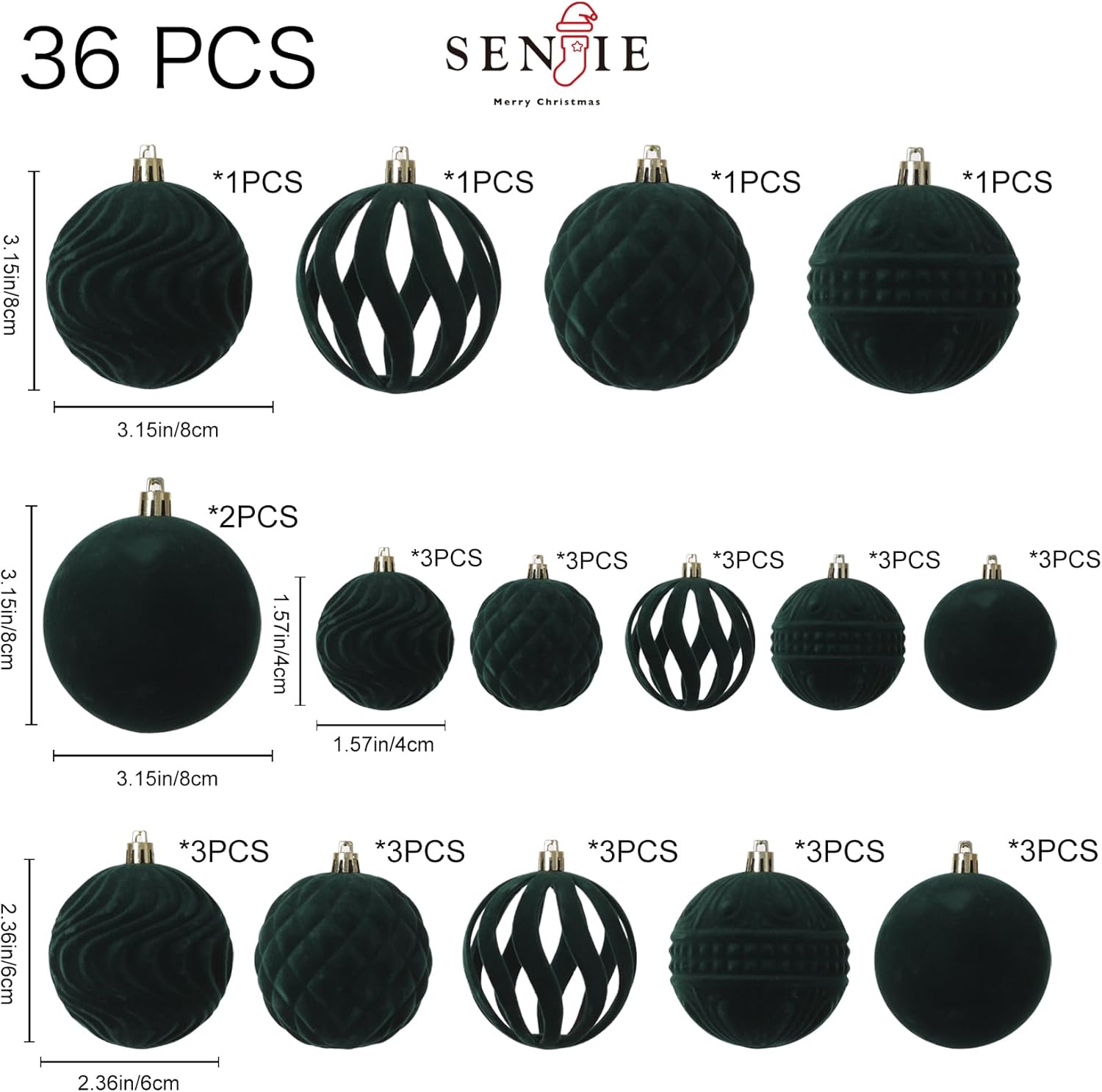 - Package List: the package contains 36pcs of flocked Christmas ball ornaments, measuring approx 3.15/2.36/1.57/inches in diameter, deep green color,not only classic styles,but also innovative styles,including five shapes and nice texture can fully meet your needs for decorating