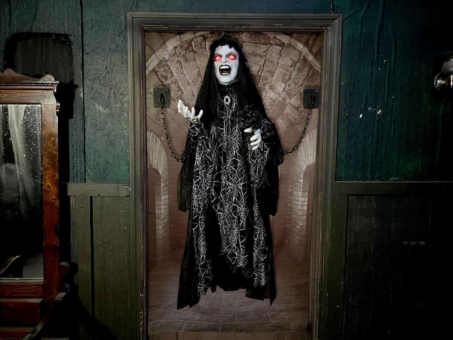 Haunted Hill Farm Animatronic Scary Demon Widow Door Greeter with Touch Activated Lights and Sound, Battery-Operated Indoor or Covered Outdoor Halloween Decoration
