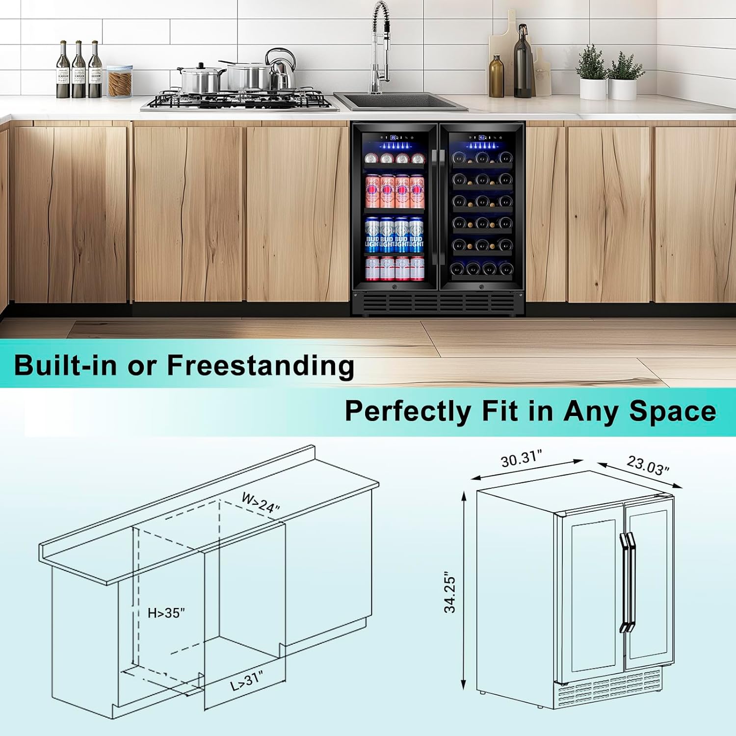 - Dual-Zone Cooling for Wine & Beverages: Enjoy perfectly chilled drinks with Velieta’s independent 30 inch dual-zone wine and beverage fridge. The left zone (35°F–50°F) keeps beverages icy cold, while the right zone (41°F–64°F) preserves wines at their ideal serving temperature. Savor every sip at its best!