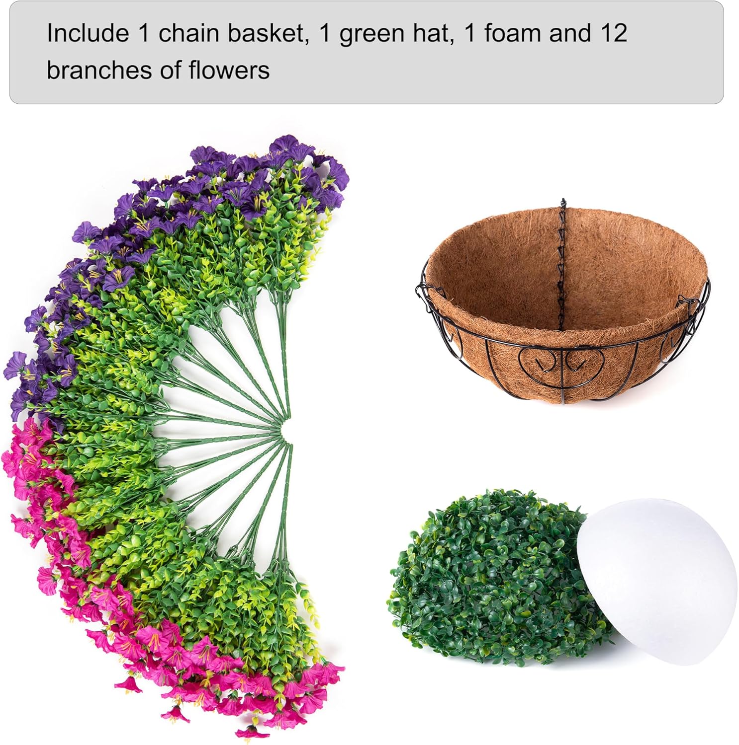- Artificial Hanging Morning Glory Flowers Basket: Package include 12 bundles Realistic silk morning glory match with green eucalyptus leaves, 1 Hanging Basket with chain, 1 foam, 1 green hat. Enjoy vibrant blooms year-round, regardless of the season or weather conditions.