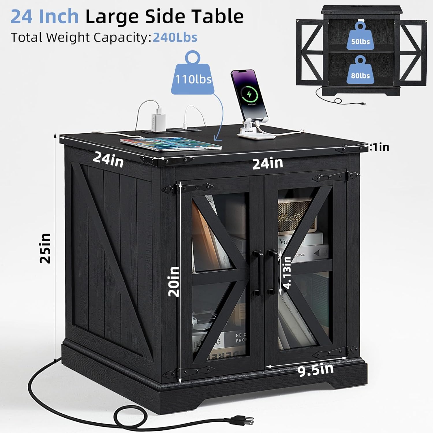 - š”[Farmhouse-Style end Table with Charging Station]This large end tables with generous storage is a perfect fusion of farmhouse and industrial metal styles. The exquisite barn-style tempered glass doors and the black metal corner accents add an elegant touch to the cabinet body, making it visually captivating from any angle.