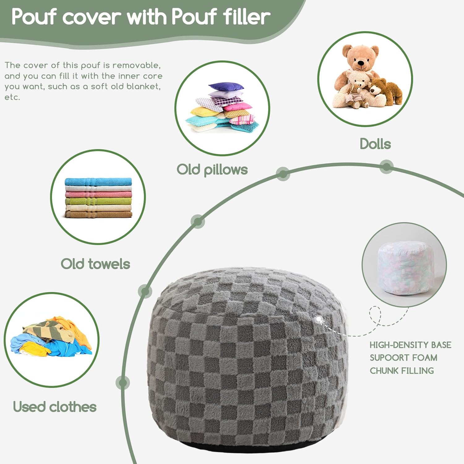 - For convenience and ease of use, this pouf ottoman comes pre-filled with memory foam chunk pouf filler, which can be easily inserted through the large round opening on the bottom with double zippers.