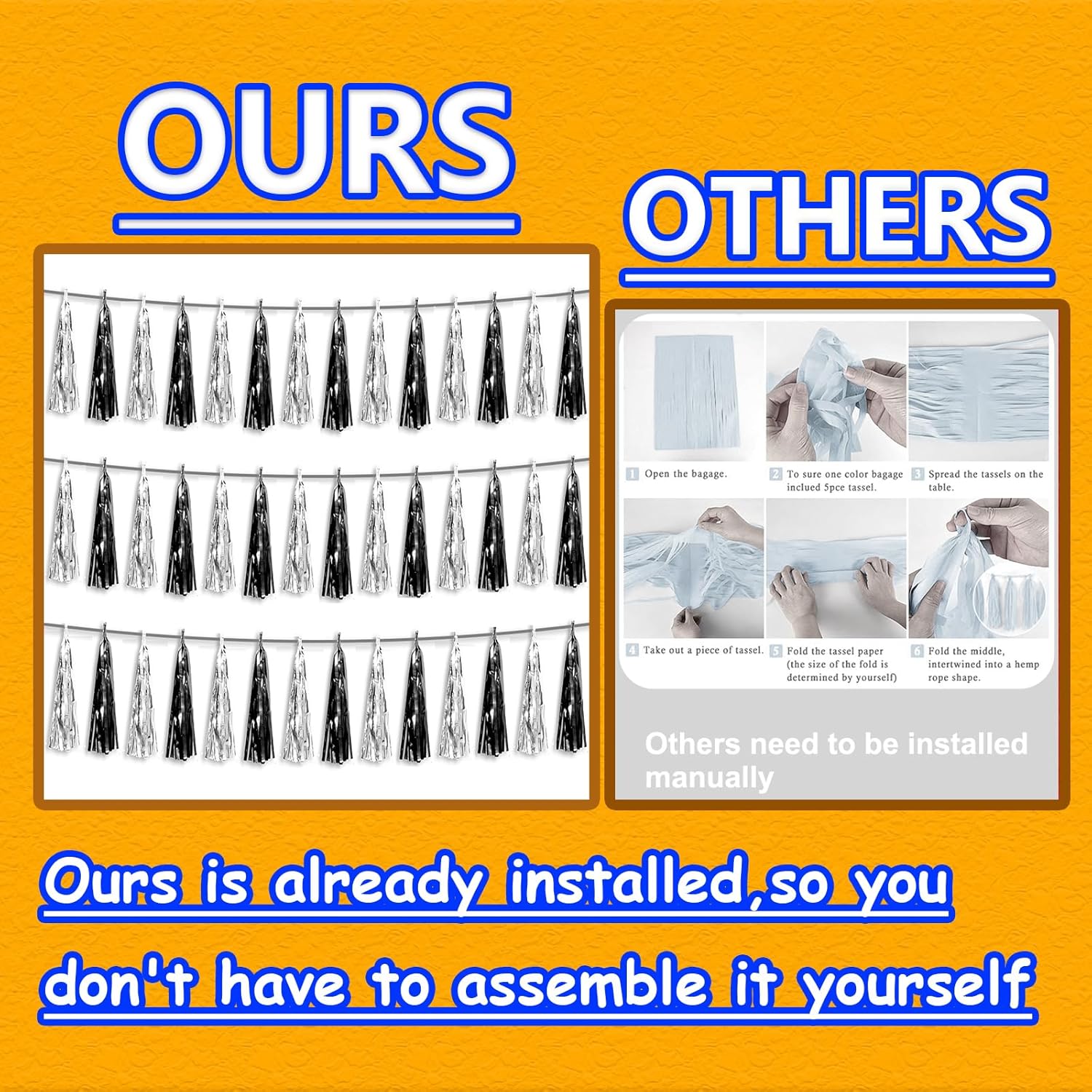 - 【Black Silver Beige Mint Gold Party Supplies Set】: The total length of the Black Silver beige mint gold birthday tassels banner is 29.5 feet, divided into 3 strips, each 9.8 feet long. Each banner contains 15 tassels, and each tassel measures 14 inches, for birthday decorations many occasions, and so on