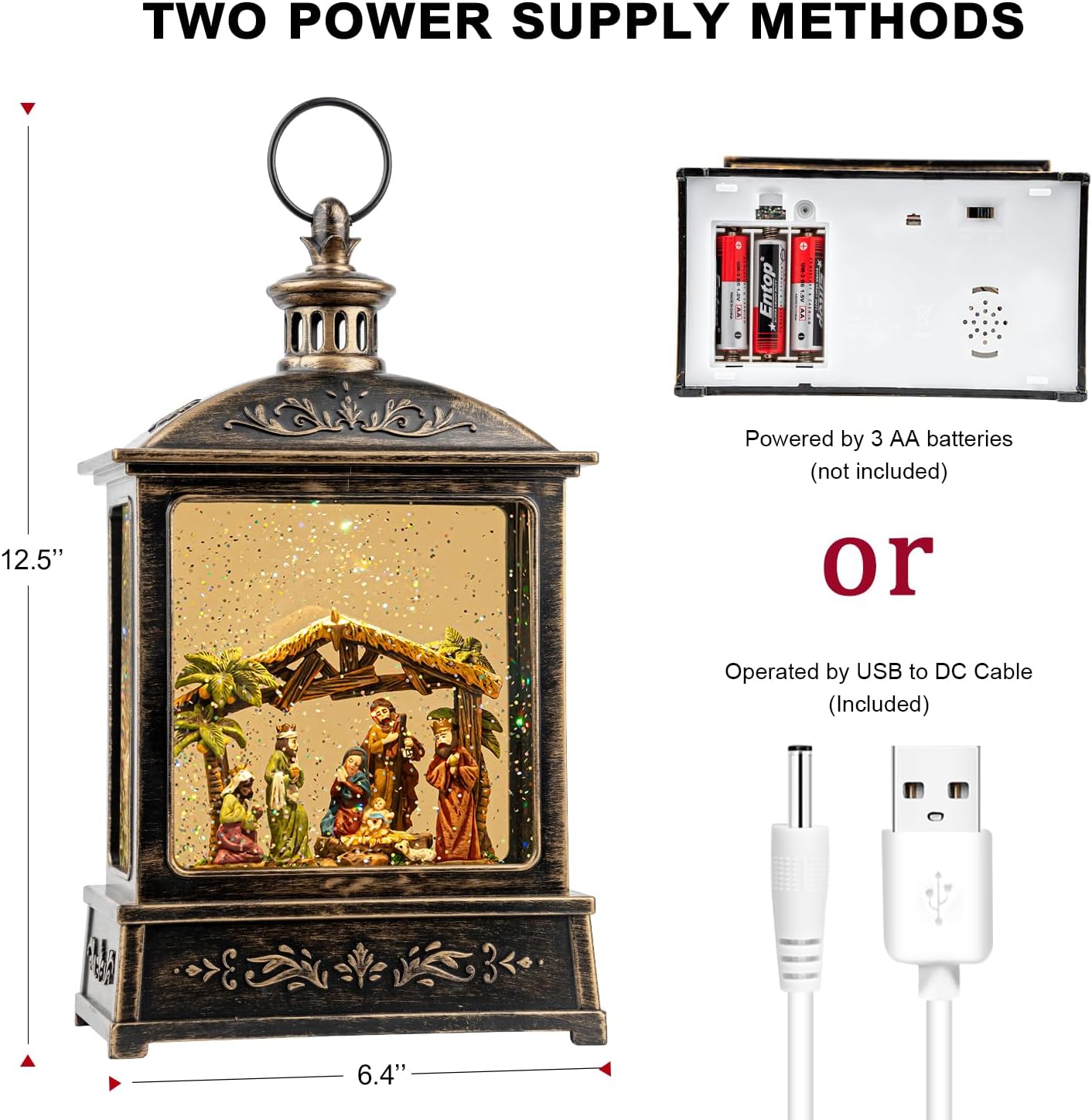 - ❄【Nativity scene】Nativity scene Lighted Water Lantern Snow globe. When turned on a warm LED shines down on the figurine and swirling glitter to give our water lantern a whimsical look for the Holiday Season.