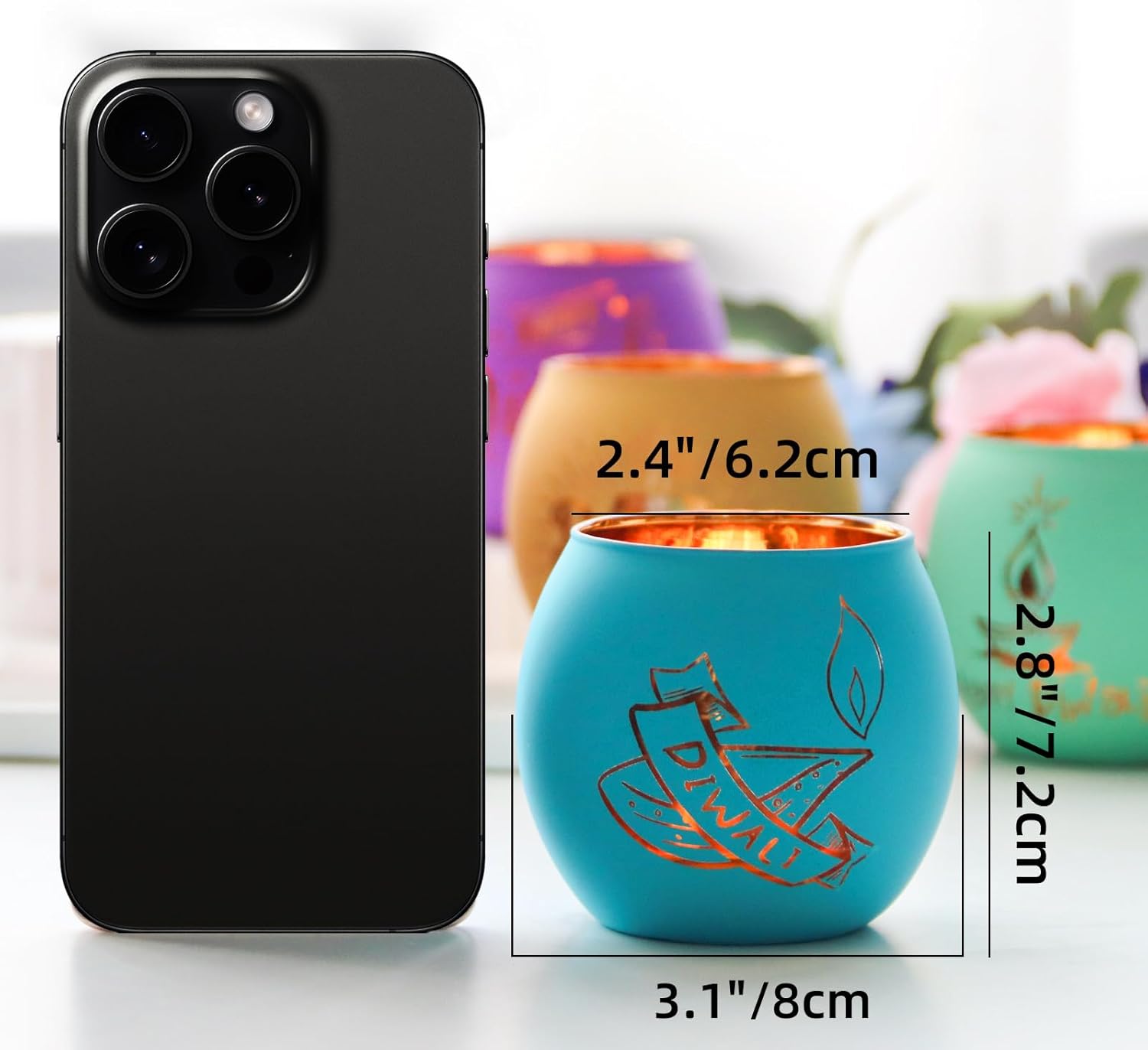 - Colorful Diwali Candle Holders: This elegant votive candle holder set includes 6 colorful candle holders. These glass candle holders are crafted using precise laser engraving techniques that add Indian oil lamps and happy Diwali patterns, perfect for creating a Diwali ambiance.