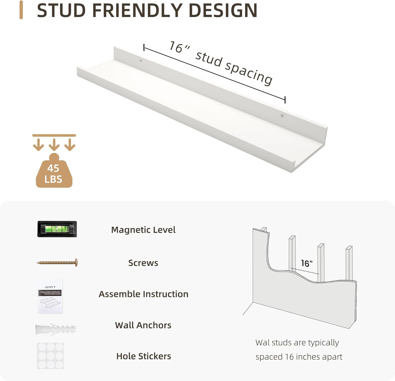 • 【Superior Quality】 Crafted from high-quality wood, each floating shelf is designed for long-lasting durability. The pre-drilled mounting holes are spaced 16 inches apart, ensuring a secure installation into wall studs.