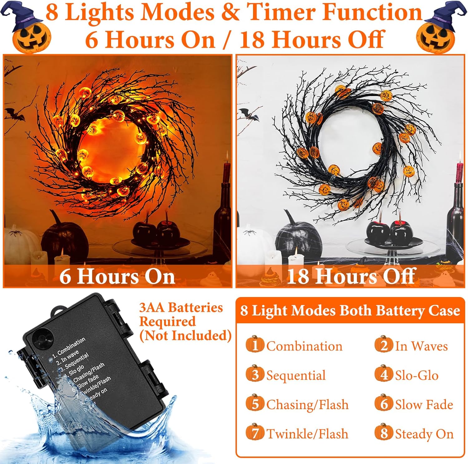 • 【8 Lighting Modes & Timer】You can use the halloween garland battery box button to switch 8 Flashing Modes:Combination,In Waves,Sequential,Slow Glow,Chasing/Flash,Slow Fade,Twinkle/Flash,and Steady On,the light will be automatically timed and keep on for 6 hours ,automatically turn off for 18 hours