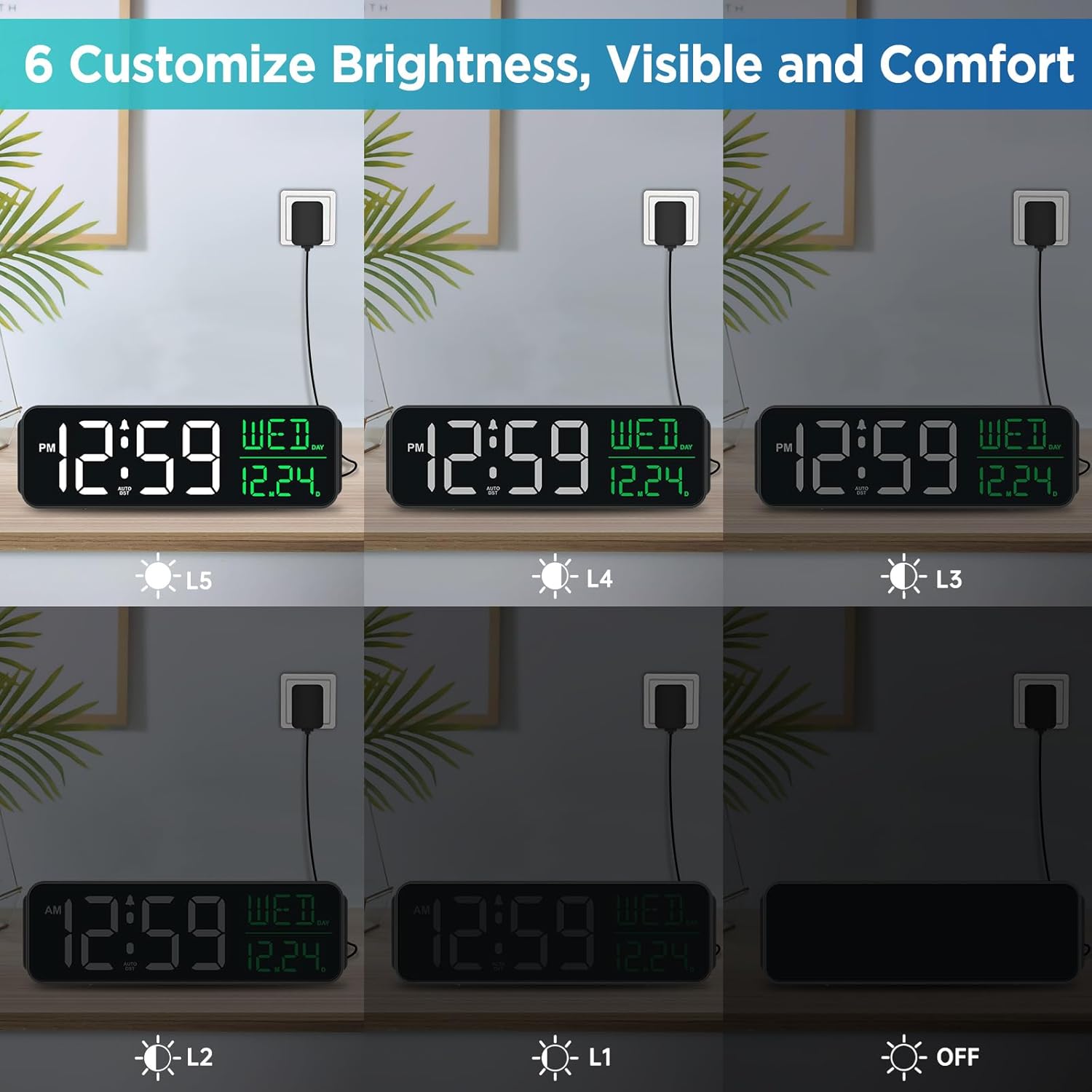 - ๐๐๐ซ๐ ๐ ๐๐ฎ๐ฆ๐๐๐ซ๐ฌ ๐ฐ๐ข๐ญ๐ก ๐๐๐ฃ๐ฎ๐ฌ๐ญ๐๐๐ฅ๐ ๐๐ซ๐ข๐ ๐ก๐ญ๐ง๐๐ฌ๐ฌ: 2-inch height of large numbers are friendly for seniors / elderly and people with poor eyesight. 5 different brightness settings ensure clock time is always visible in various lighting conditions: brighter and comfort in day or lower brightness at night for an improved sleep or completely off at night.