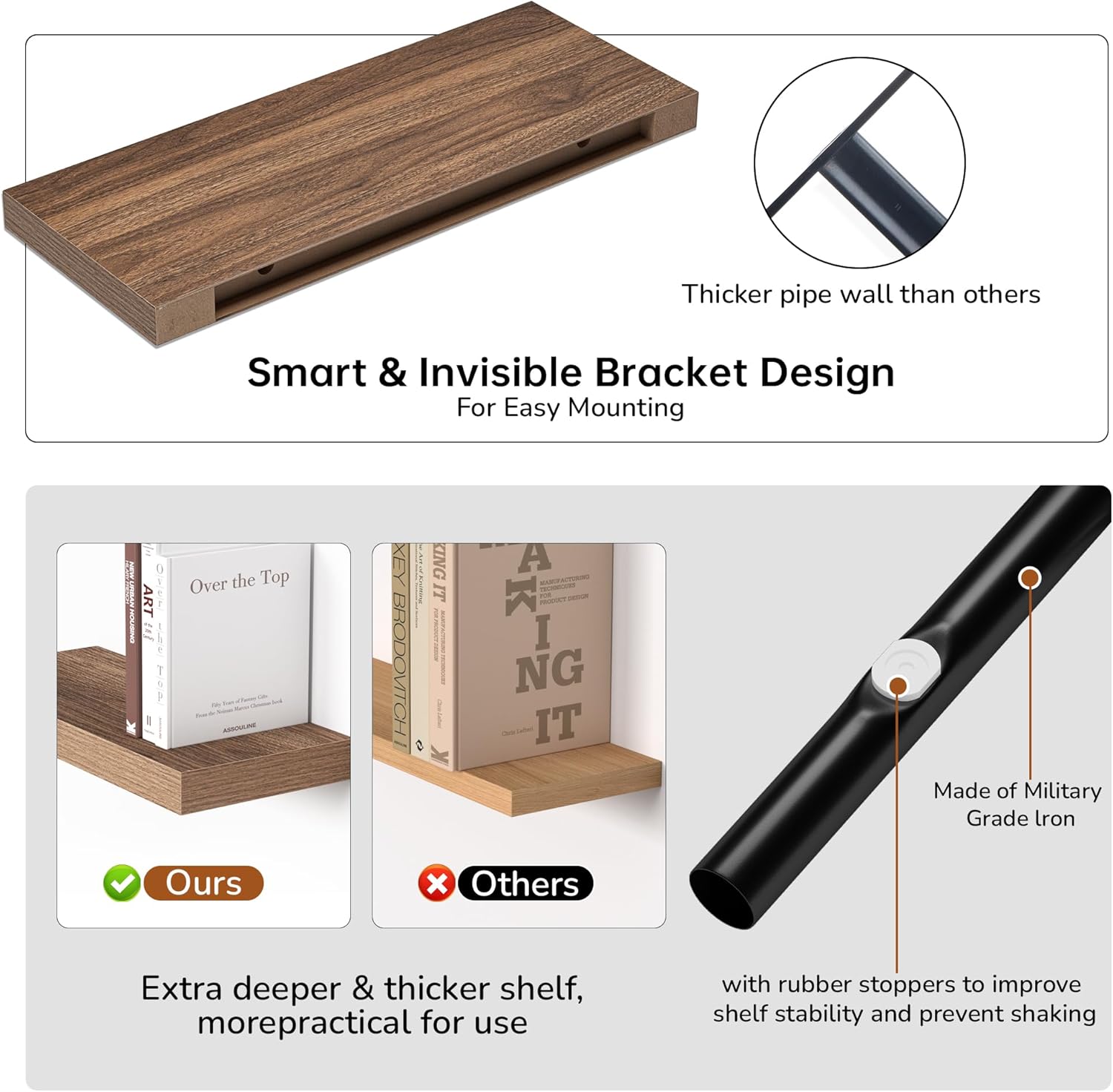 - Extra Deeper & Thicker - Each board measures 24"W x 9"D x 1.6"H. Extra deeper and thicker design in order to bring maximizes storage space and weight capacity, even hold up to 50 lb each. This floating shelf taking up zero square feet, reduces clutter and highlights dΓ©cor in compact spaces.