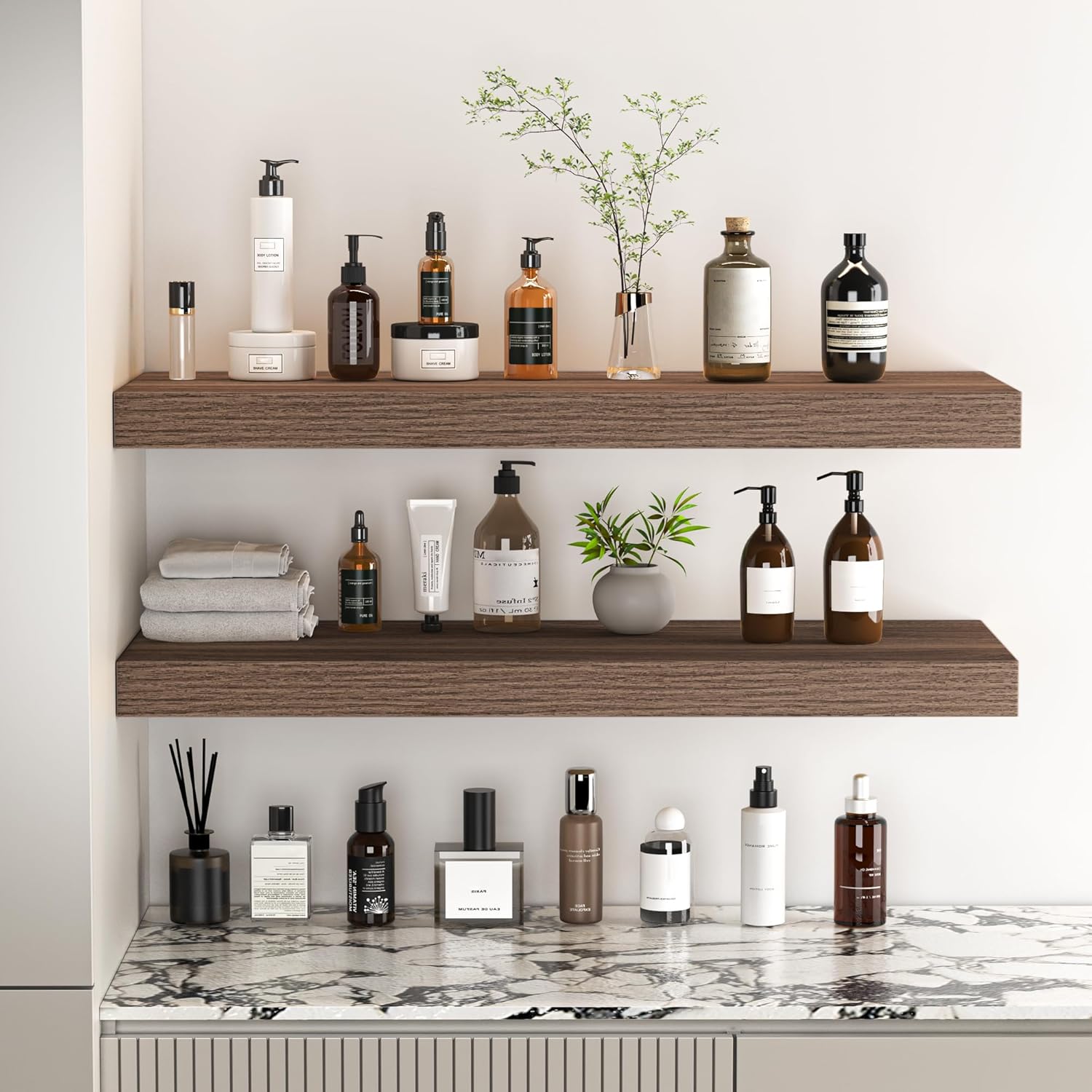 - Multi-scene & Functional - Mount in the bathroom perfect storage of beauty, hair products or aromatherapy. Mount in the bedroom to hold your books, cosmetics and personal privacy things. Mount in the kitchen to hold spices and jars. Or as a display shelf mount in the living room to show your picture frames, trophies or favorite collection. The rustic shelves can help make full use of the empty wall, which is much more space-saving and makes your room look larger and tidier.