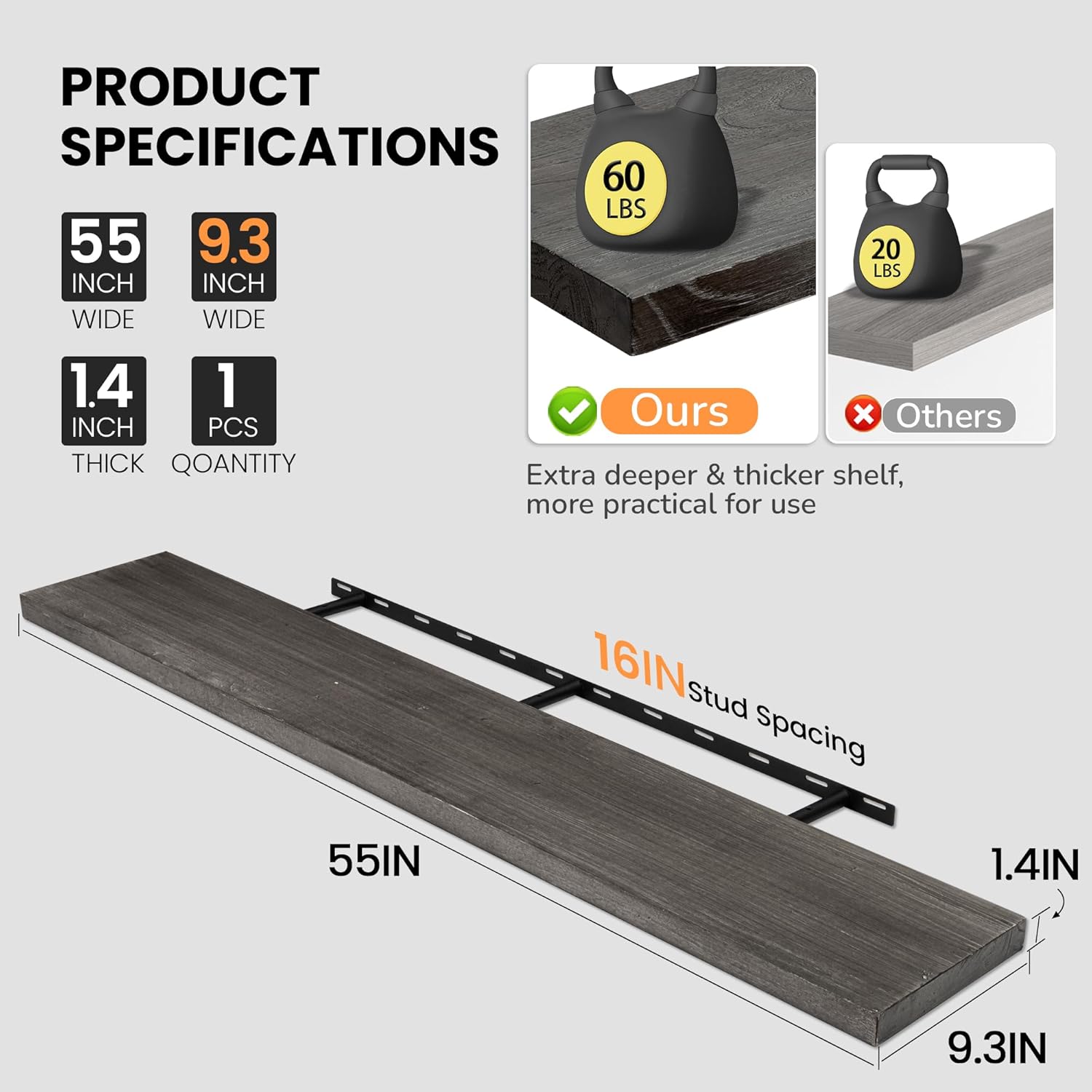 - 9.3" DEEP SOLID ELM WOOD: Fun Memories flat-edge floating shelves are handcrafted from reclaimed elm wood and measure 55" x 9.3" x 1.4" each. Featuring natural grain, knots, and color variations, they add warmth and rustic charm to any space. Mount them vertically, side by side, or in corners for a clean, stylish look