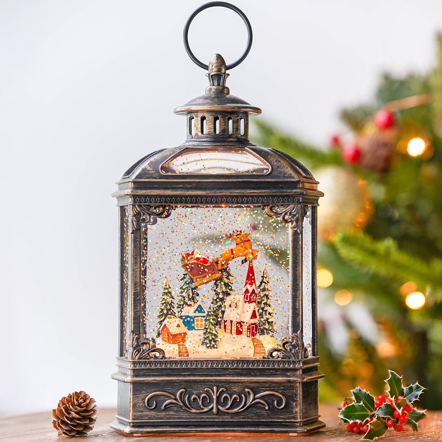 - 🎅🎄【Snow Globe Lantern】Watch as Santa takes off for his journey over the Christmas Village, pulled by his trusted reindeer, with a sleigh full of gifts. When turned on a warm LED shines on the figurine and swirling glitter to gives our Christmas globe a whimsical look for the Christmas Holiday season.