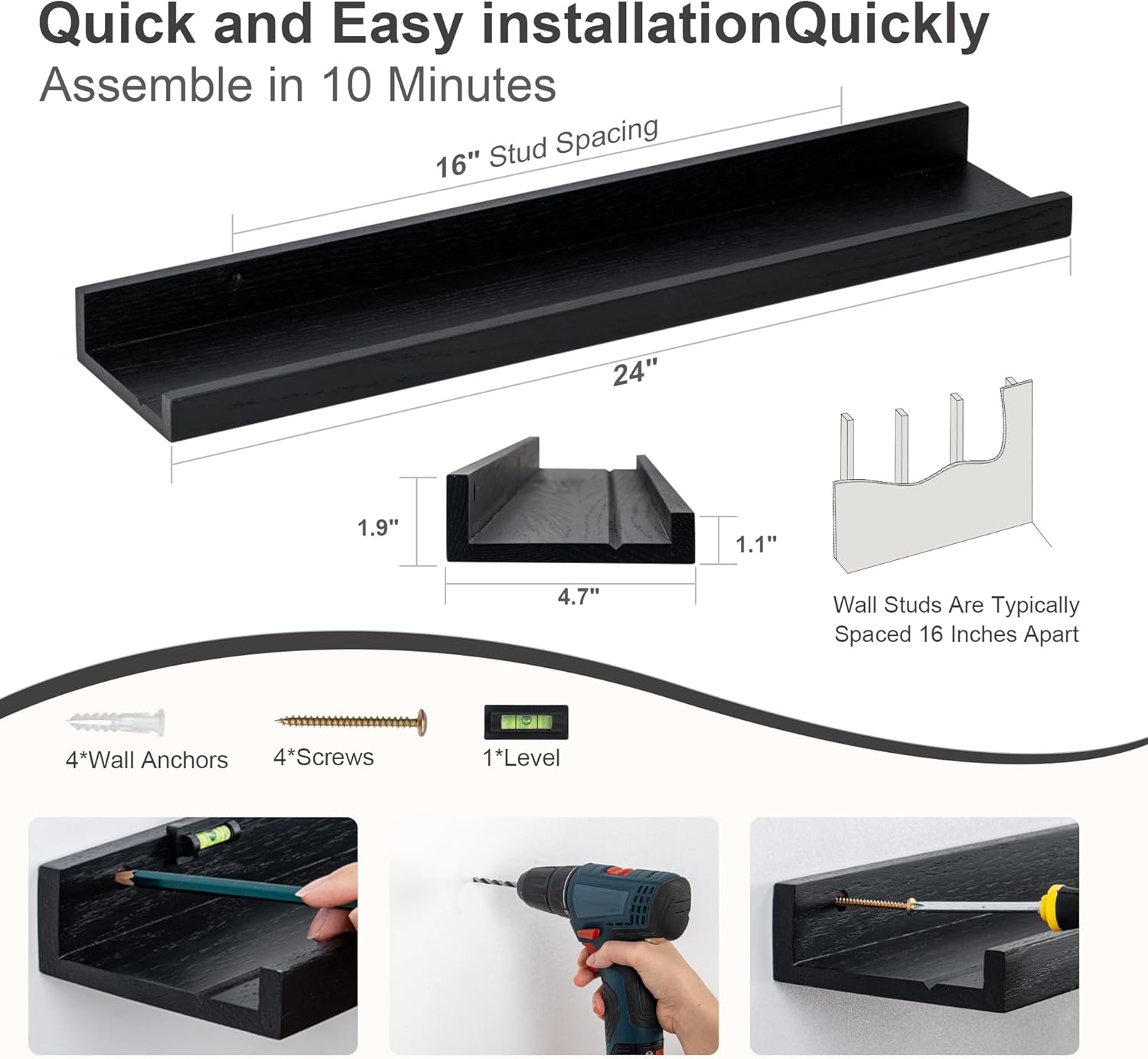 Floating Picture Ledge Shelves 24 Inch Solid Oak Wood Set of 2, Rustic Wall Storage Shelves with Lip, Kids Bookshelf, Photo & Picture Ledge Shelves for Bedroom, Living Room, Kitchen