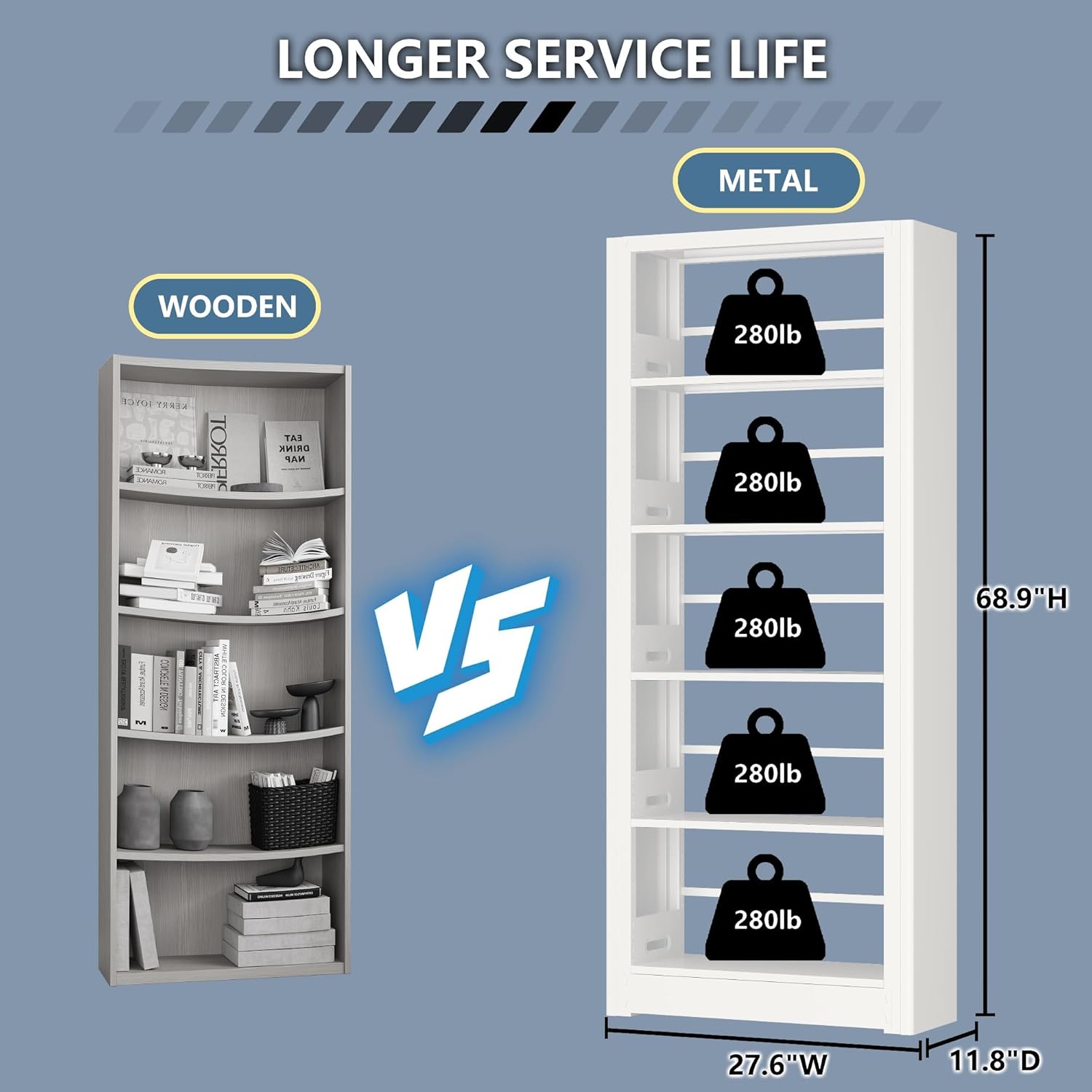 5-Tier Metal Bookshelf, 69" Tall Bookcase, Adjustable Bookshelves with Deep Display Shelves, Heavy Duty Book Shelf, Open Book Cases for Living Room, Home, Office, Library, Garage (White)