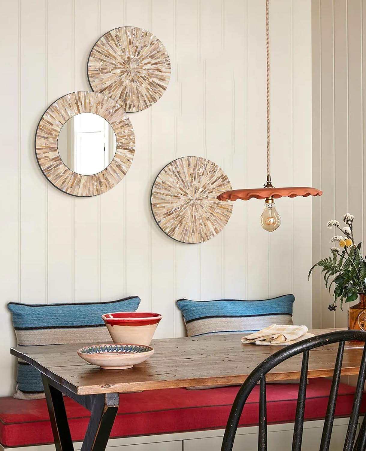 - HANDMADE, NATURAL WALL DECOR - Handcrafted from real mother of pearl by our experienced craftsmen, this unique mirror wall art set adds distinctive flair to your living or working space. Its timeless design fit in modern, electric, boho, rustic, farmhouse and any other styles nicely, bringing texture and interest to your rooms. [Note: Because the cut pieces are put on individually by hand, items received may be slightly different from pictures shown]