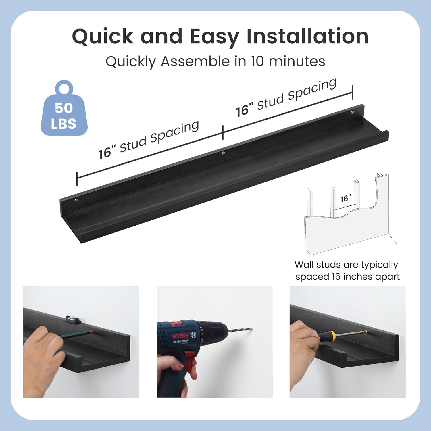 Picture Ledge Wall Shelves - 36 Inch Width Set of 3, Solid Pine Wood Rustic Floating Ledge Shelves for Kids' Room, Bedroom, Kitchen, Bathroom, Living Room, Nursery Display Wall Decor, Black