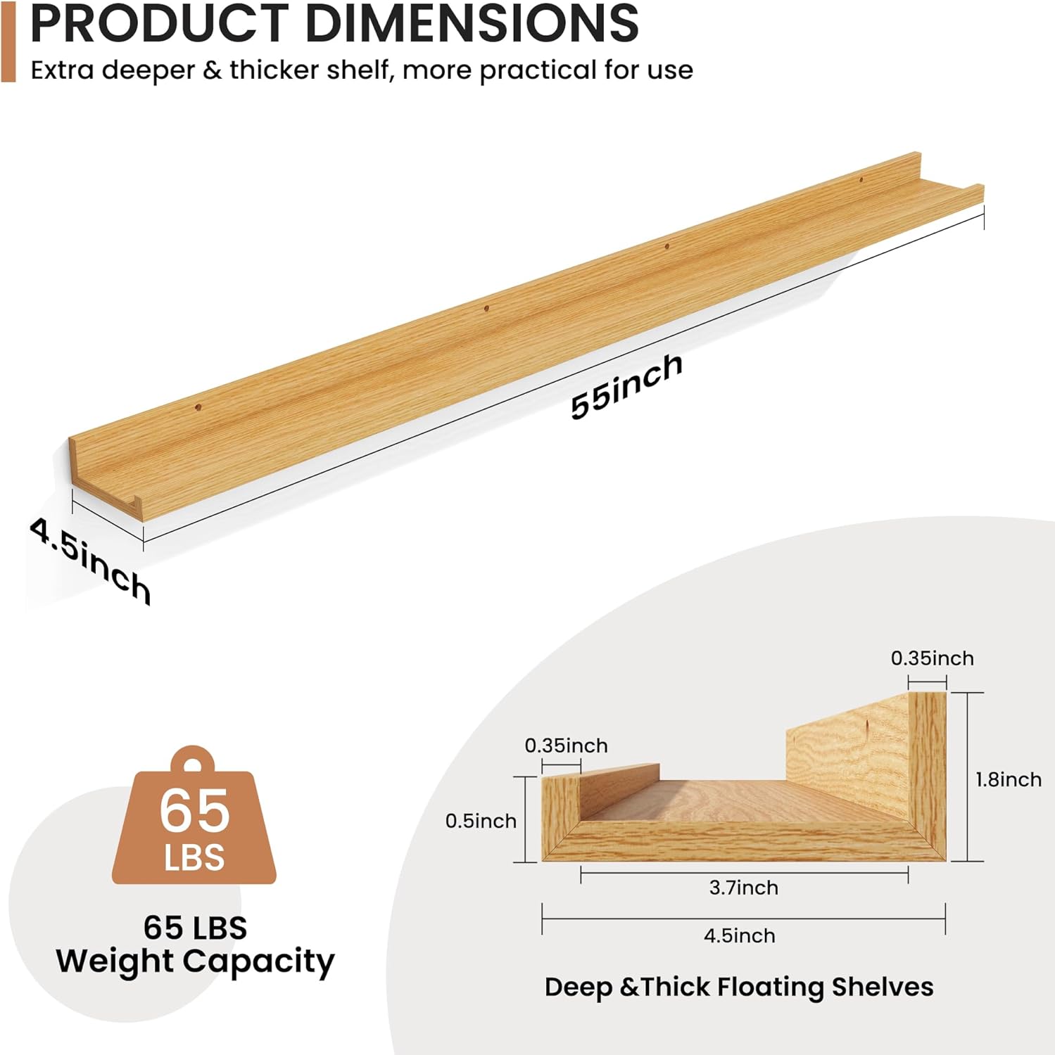 Fun Memories Picture Ledge Shelves Set of 2, 55 Inch Rustic Wall Mounted Floating Shelves with Lip for Home Storage and Décor in Bathroom, Kitchen, Nursery, Bedroom, Living Room, Oak