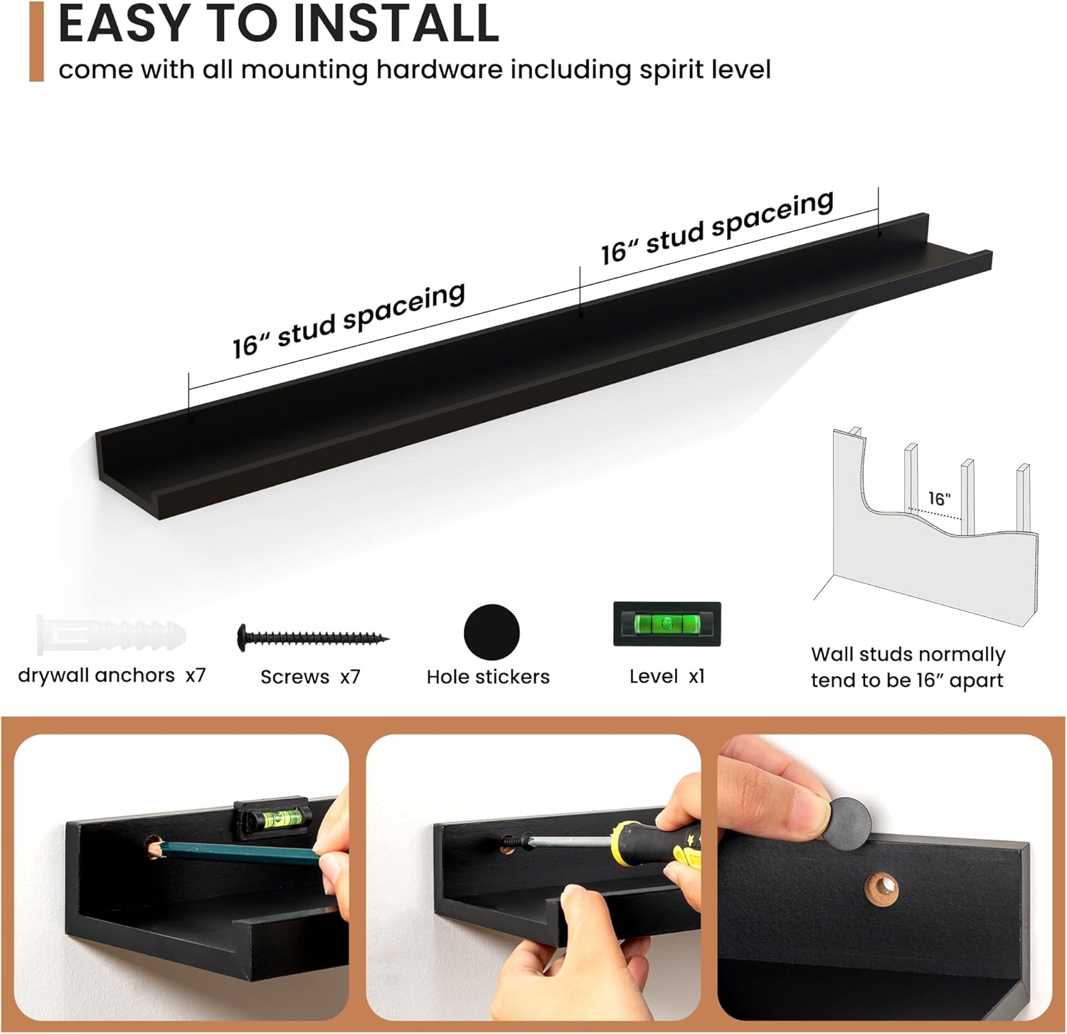Fun Memories Picture Ledge Shelves Set of 2, 48 Inch Rustic Wall Mounted Floating Shelves with Lip for Home Storage and Décor in Bathroom, Kitchen, Nursery, Bedroom, Living Room, Black