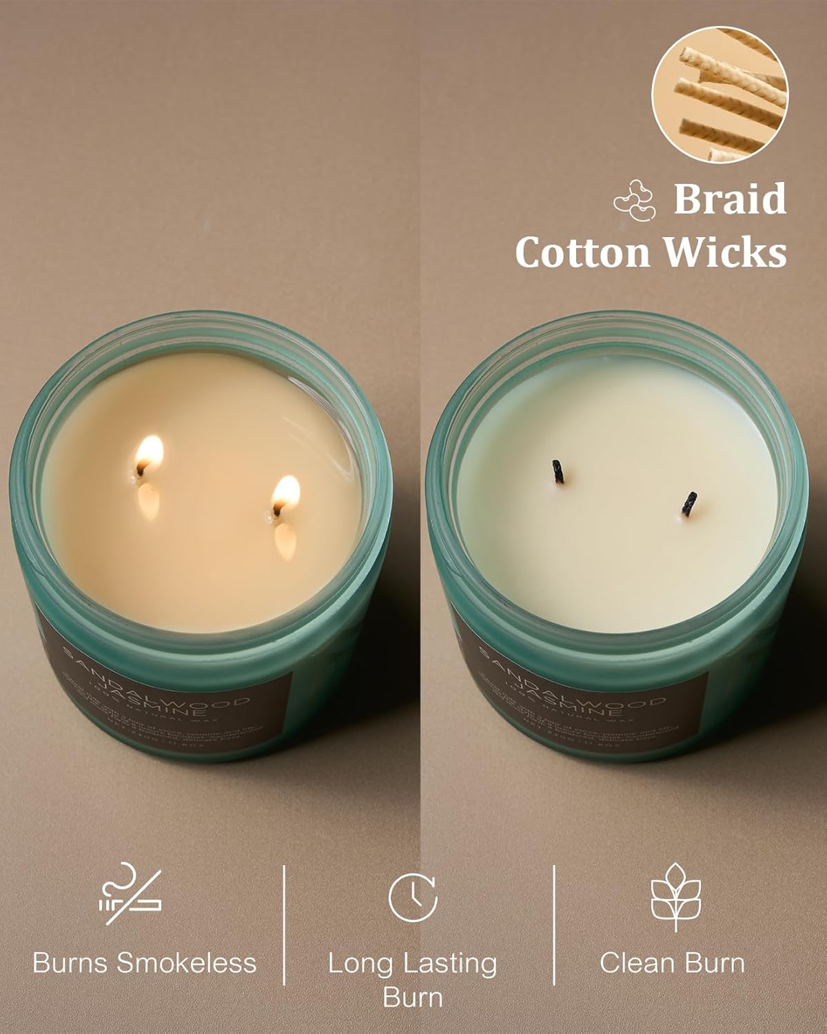 - Clean Consistent & Even Burn - Using 2 American made lead-free cotton wicks for a even burn result. They're cotton flat braid wicks with paper throughout, providing increased rigidity and burn more consistently than 100% cotton wicks. Designed to reduce carbon buildup which leads to black soot.