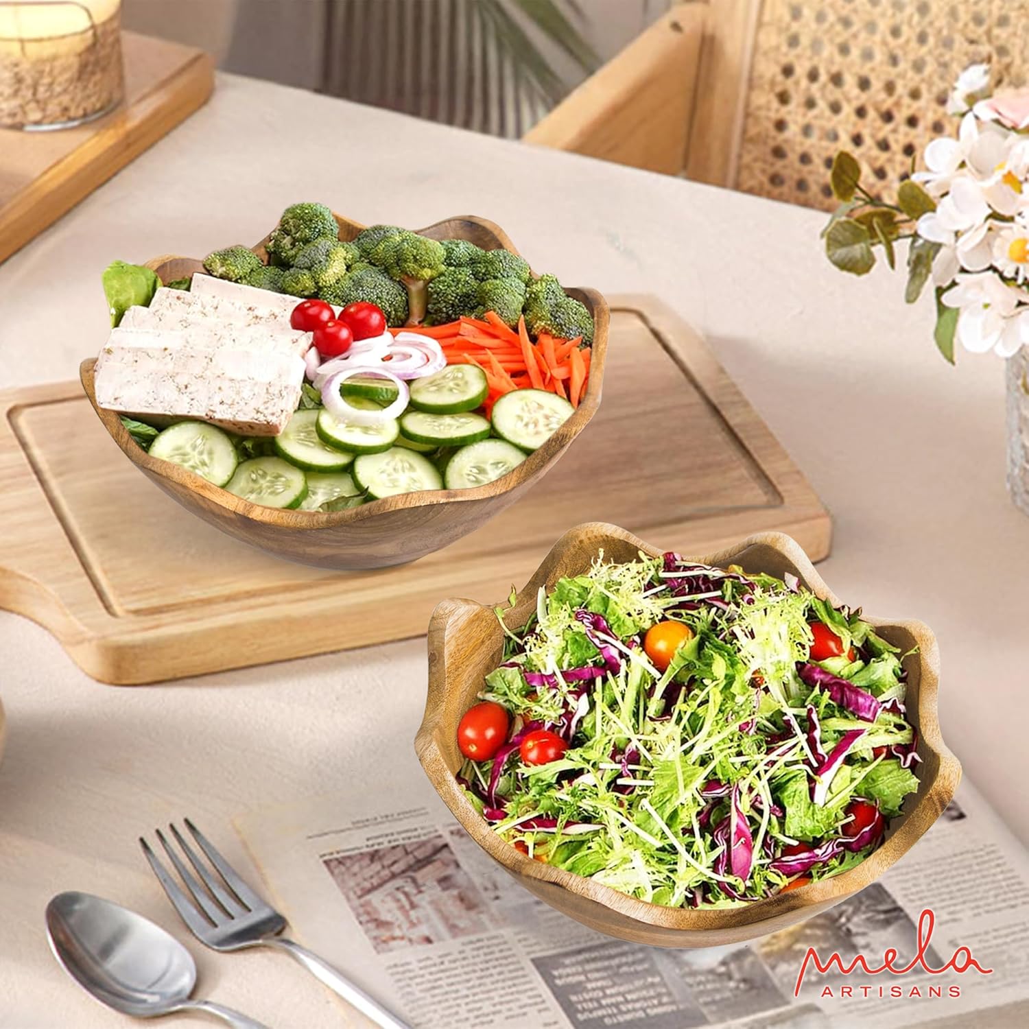 Mela Artisans Wooden Scalloped Bowl - Set of 2, Large & Medium |Mango Wood Natural Grain Finish | 12x4x12” and 10x4x10” | Fits Bread, Fruits, Salad or Popcorn