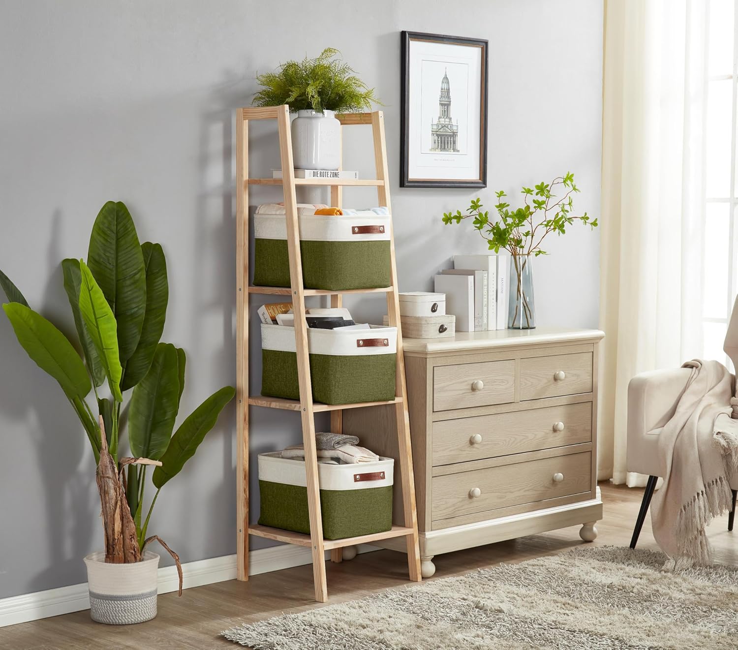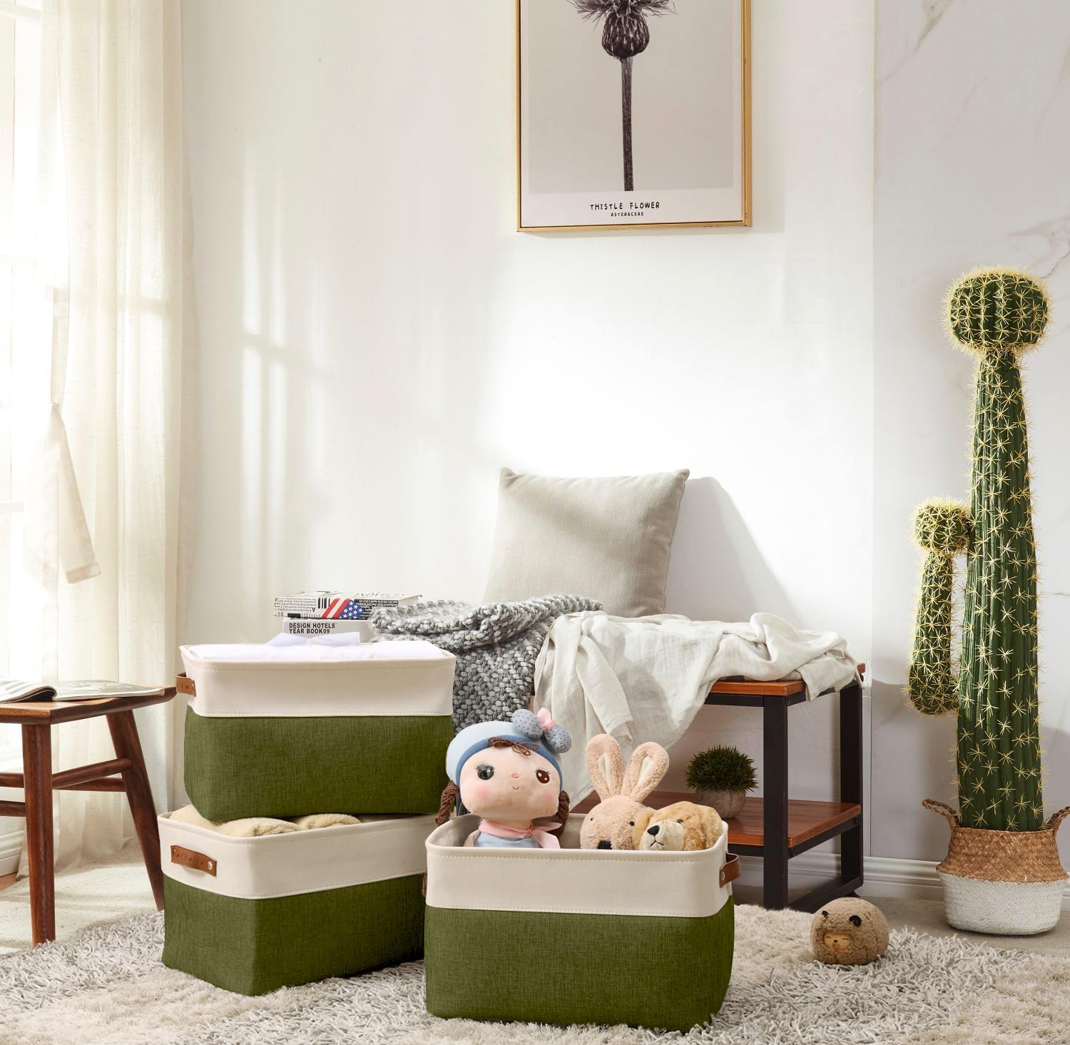 DECOMOMO Storage Bins Fabric Storage Baskets for Shelves, Linen Closet Organization Toys Nursery (Olive Green and White, Large - 3 Pack)