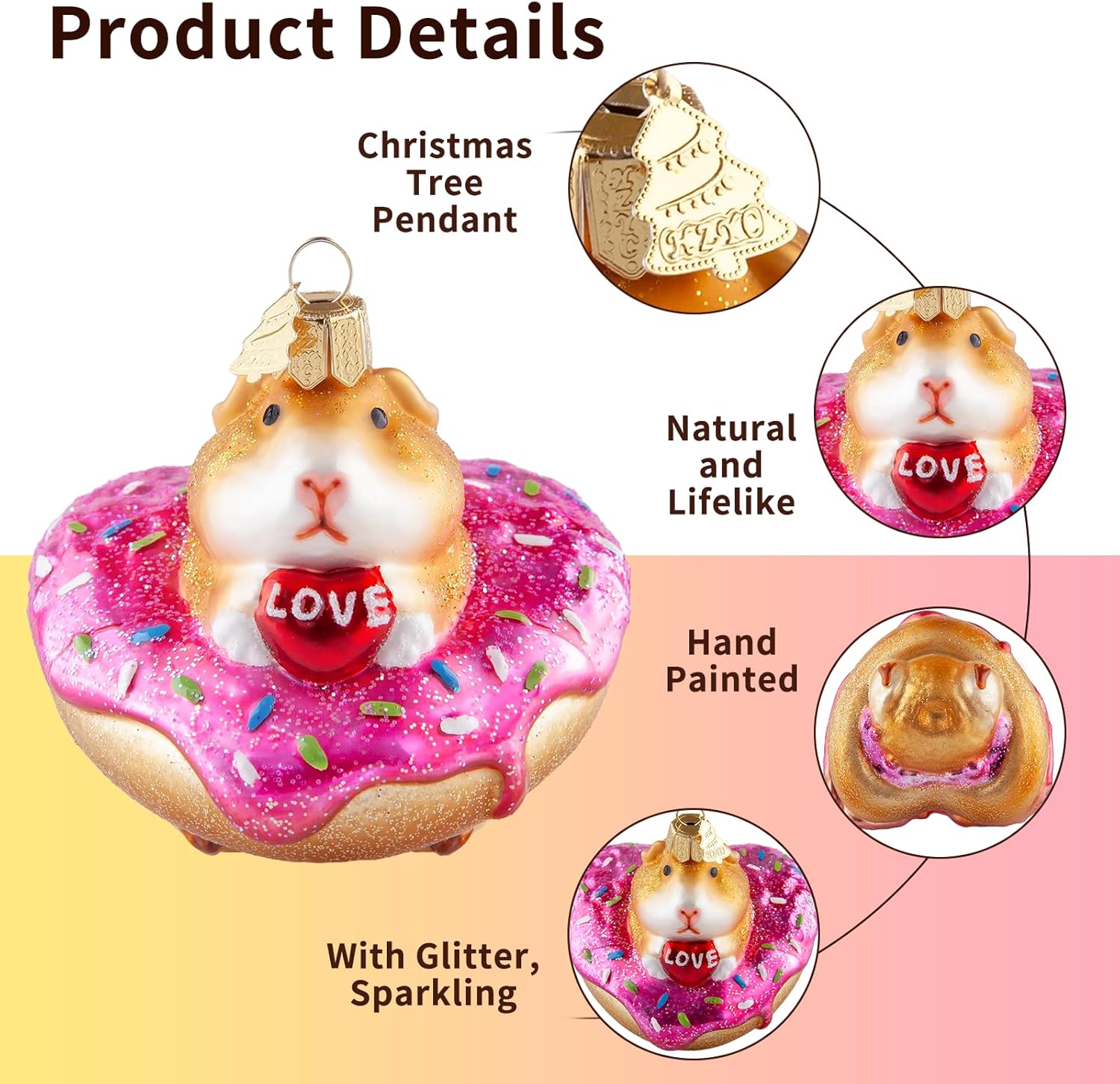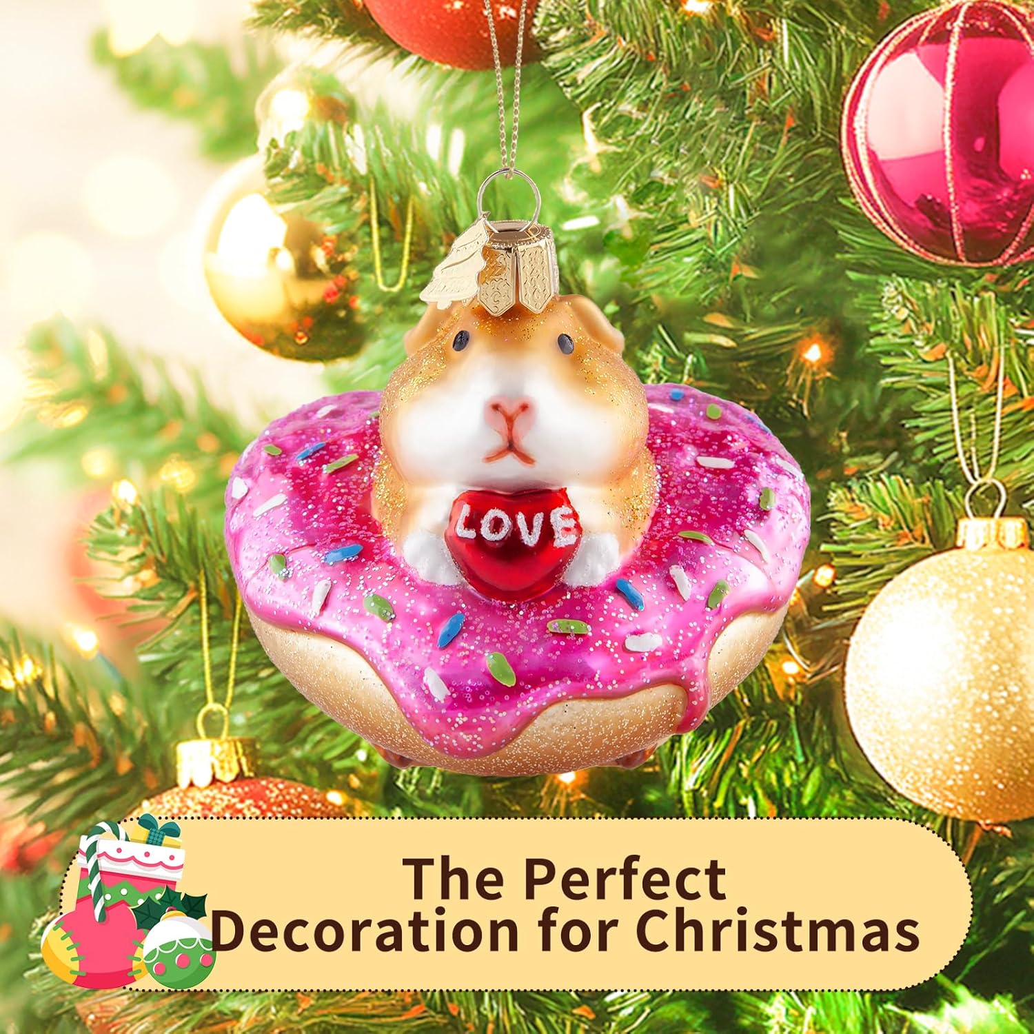 - Cute & Unique Design: Hand-blown glass christmas ornament adopts the image of a cute guinea pig. The golden guinea pig holds "love" and sits on a heart-shaped donut. It is cute and sweet. The whole is hand-painted, with exquisite craftsmanship, delicate and vivid image depiction. You can decorate any place you want to decorate, and believe it can be integrated well