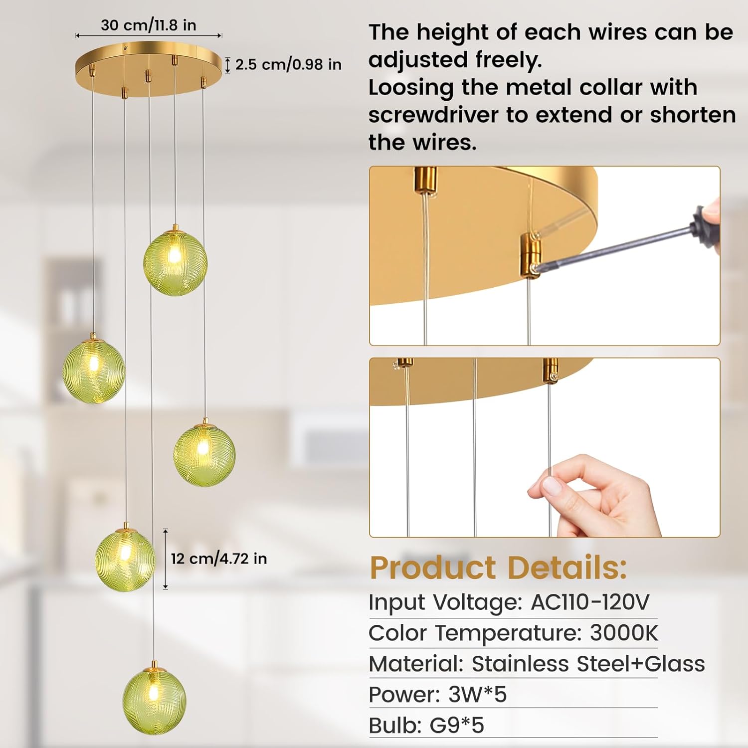 - Unique Design: This chandelier is composed of 5 green transparent glass lamp shades, creating a fresh and eye - catching visual effect. The canopy is made of stainless steel with a brass - gold surface, combining durability and an elegant appearance.The cluster chandelier was made to integrate with any staircase. It has a sleek and modern design that looks great in any setting.