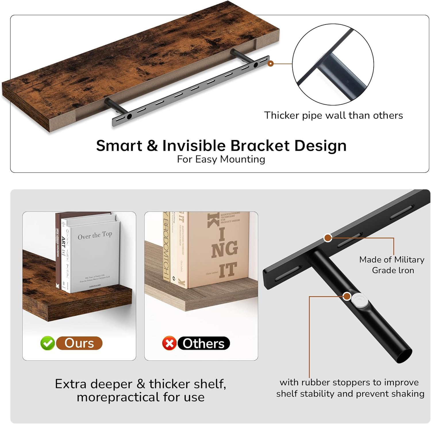 - Extra Deeper & Thicker - Each board measures 36"W x 8"D x 1.8"H. Extra deeper and thicker design in order to bring maximizes storage space and weight capacity, even hold up to 70 lb each. This floating shelf taking up zero square feet, reduces clutter and highlights décor in compact spaces.