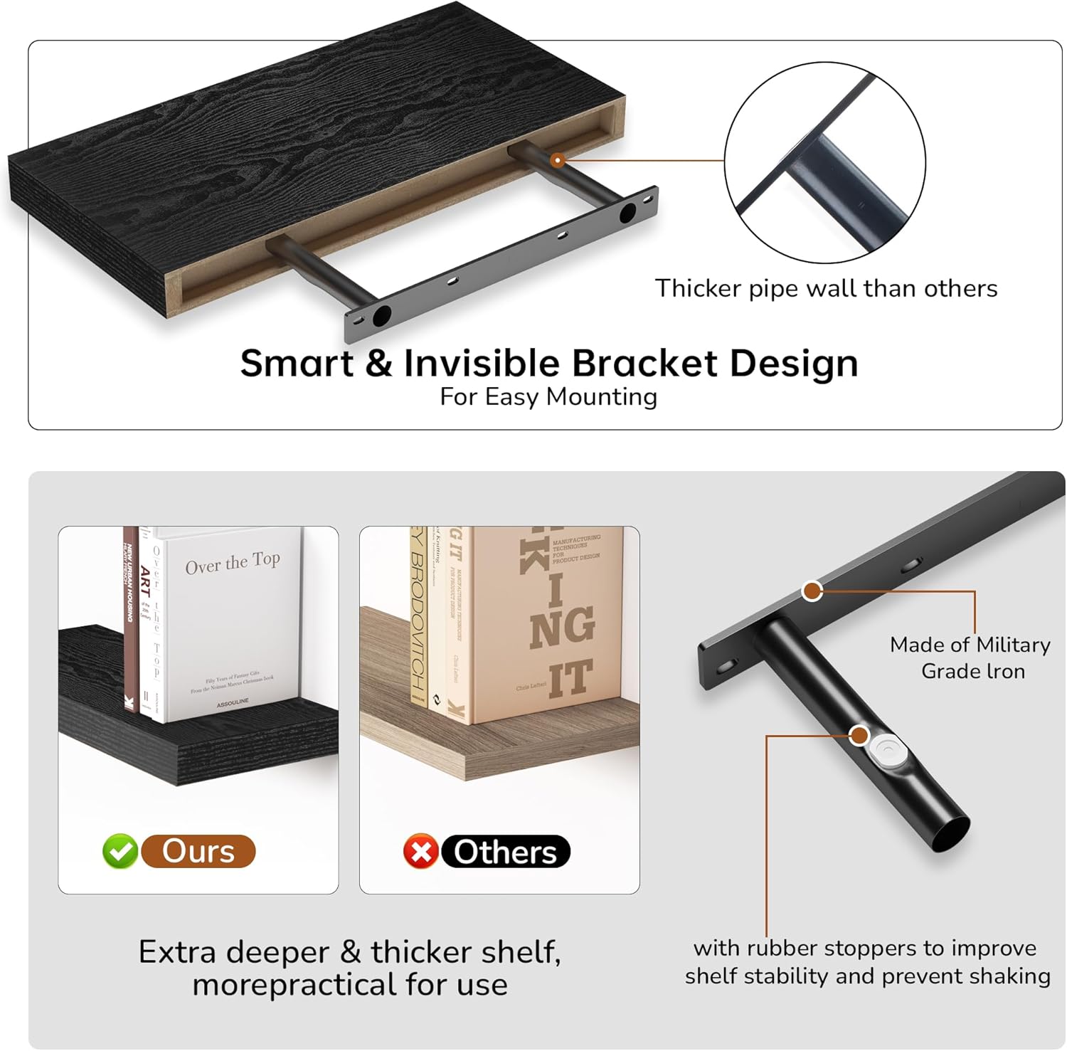 - Extra Deeper & Thicker - Each board measures 16"W x 8"D x 1.5"H. Extra deeper and thicker design in order to bring maximizes storage space and weight capacity, even hold up to 30 lb each. This floating shelf taking up zero square feet, reduces clutter and highlights décor in compact spaces.