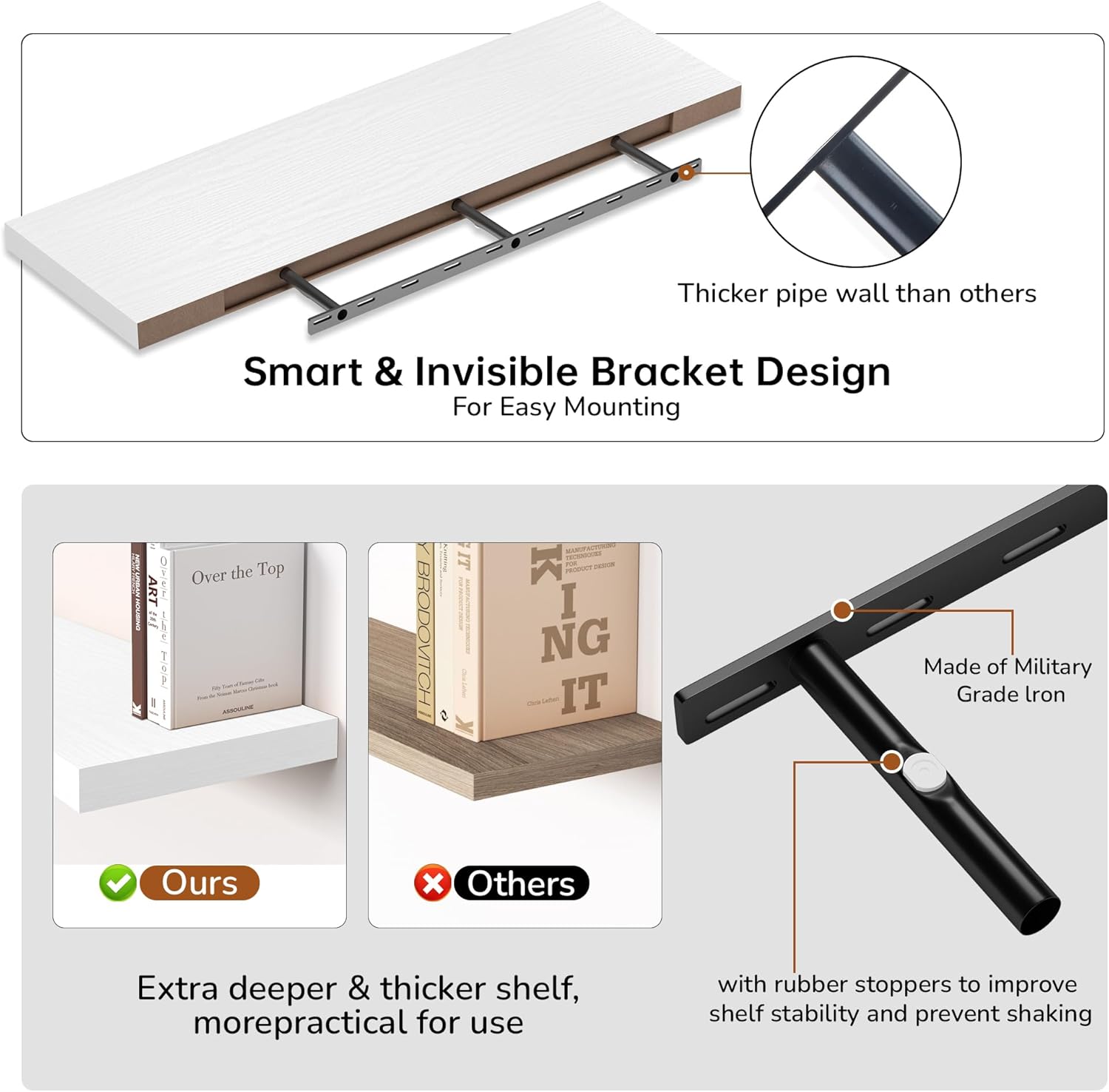 - Extra Deeper & Thicker - Each board measures 48"W x 12"D x 1.8"H. Extra deeper and thicker design in order to bring maximizes storage space and weight capacity, even hold up to 75 lb each. This floating shelf taking up zero square feet, reduces clutter and highlights décor in compact spaces.
