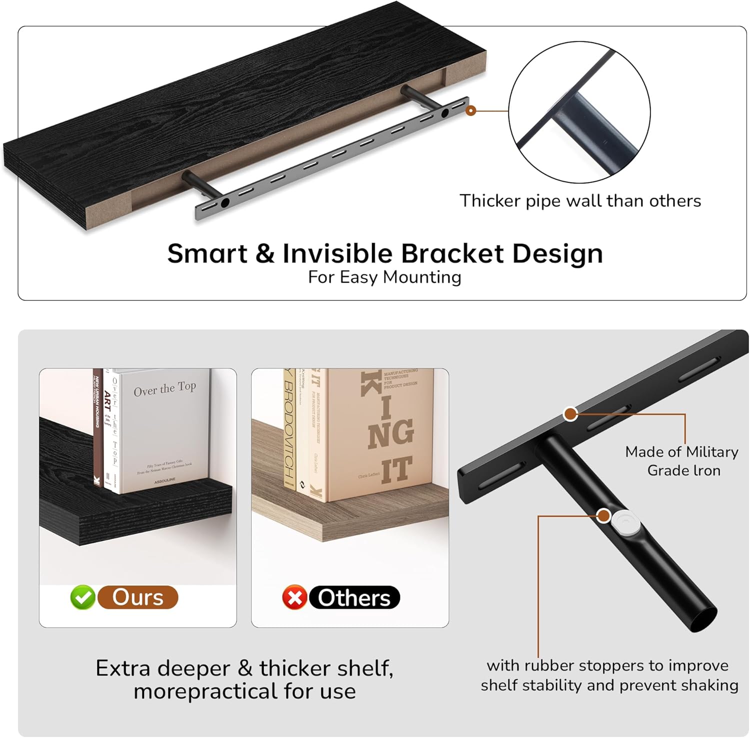Fun Memories 36 Inch Floating Shelves - Deep Rustic Black Wooden Wall Shelves - Extra Deeper & Thicker Wall Mounted Storage Shelf for Bedroom, Kitchen, Farmhouse - 2 Pack, Rustic Black
