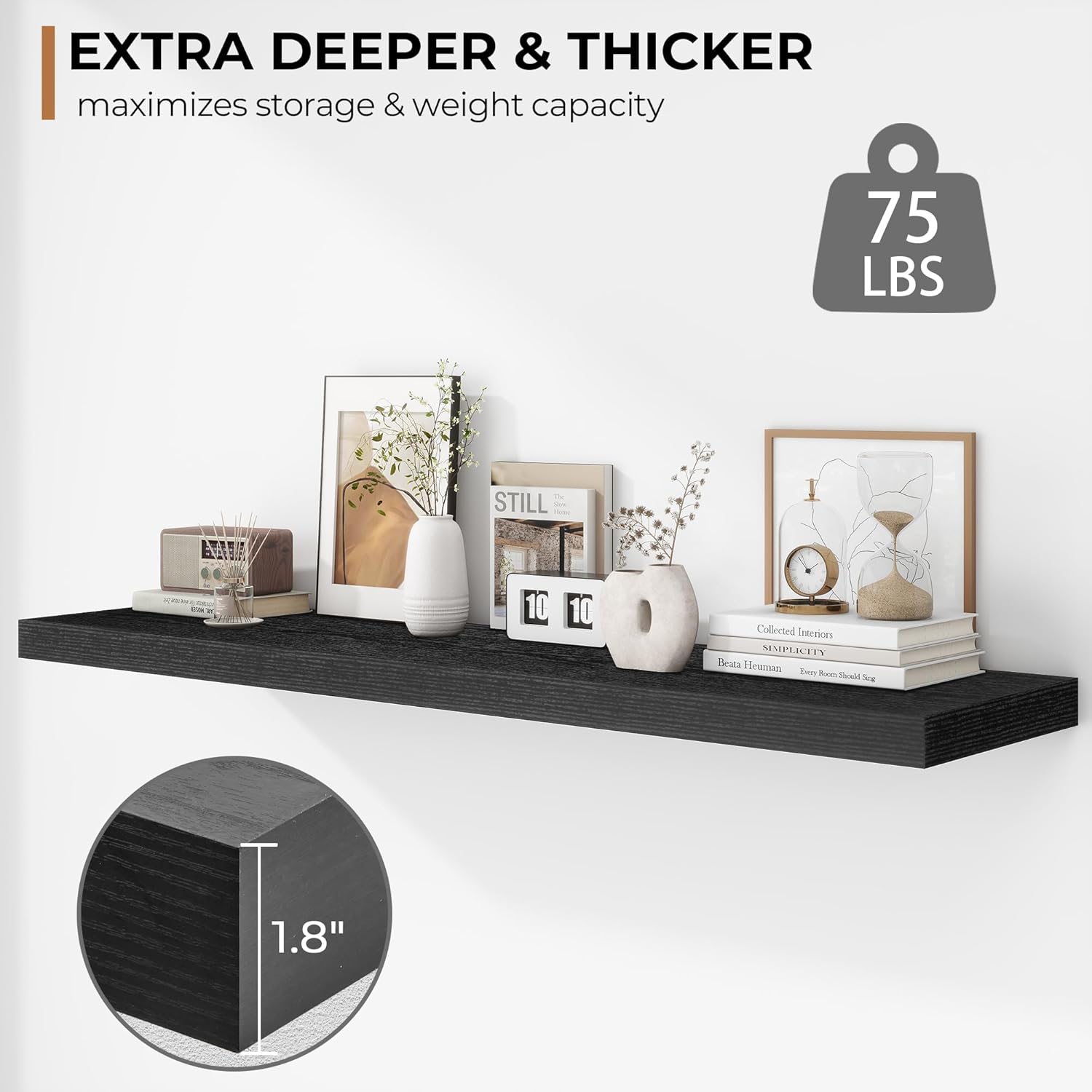 - Extra Deeper & Thicker - Each board measures 48"W x 12"D x 1.8"H. Extra deeper and thicker design in order to bring maximizes storage space and weight capacity, even hold up to 75 lb each. This floating shelf taking up zero square feet, reduces clutter and highlights décor in compact spaces.